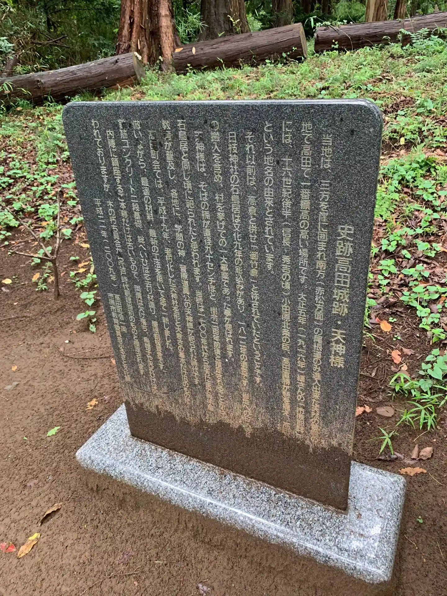 高田直勝が城を構えた場所で、地名の由来にもなっています。雑木林の中に大きな楠と祠がありました。