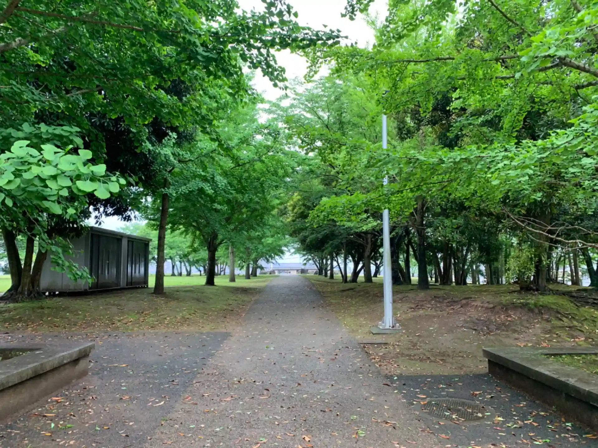 有吉貝塚公園の中にある神社。境内や公園には白くなった縄文時代の貝殻や土器のようなものが散らばっていました。
