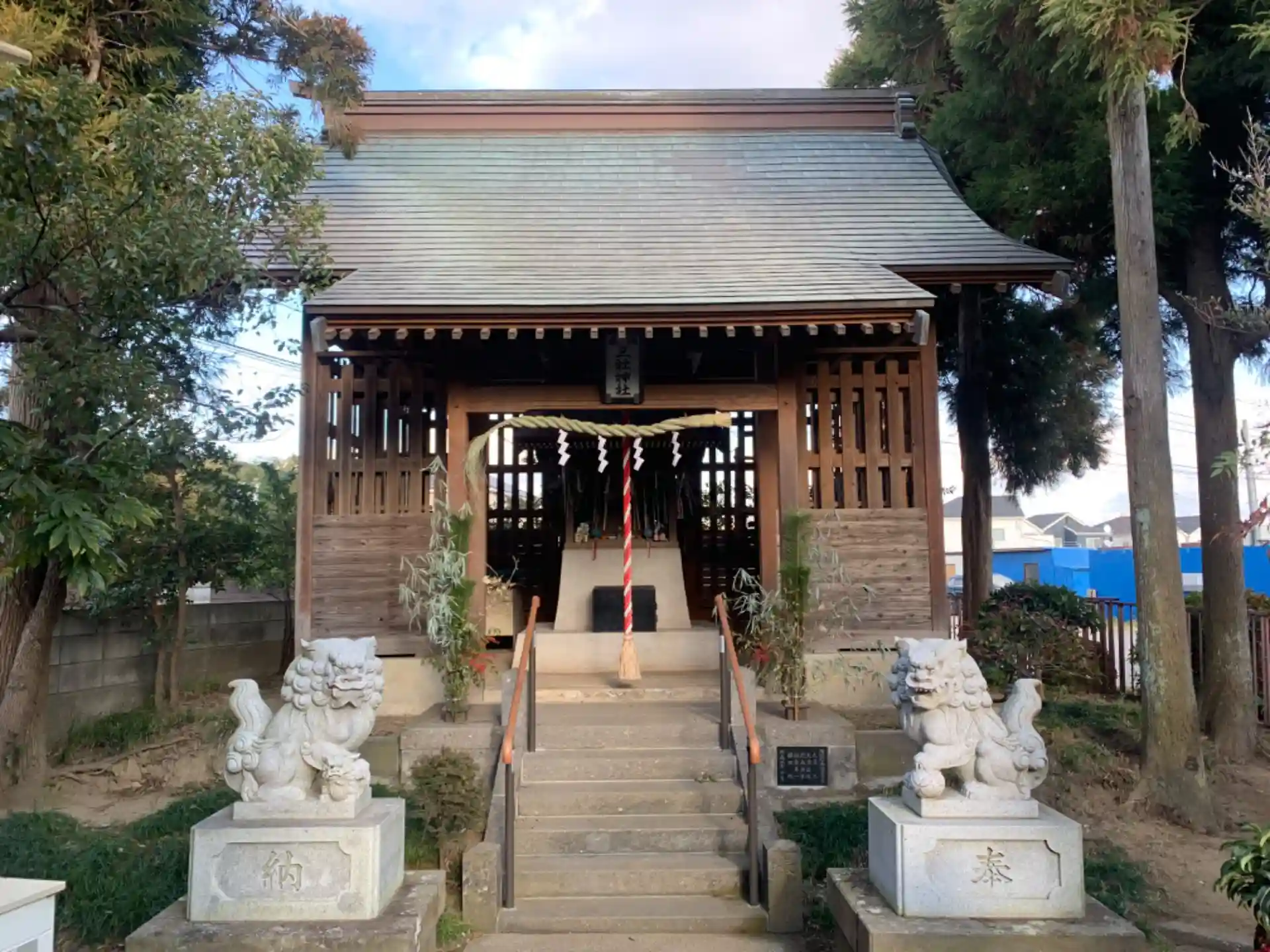 住宅地の一角に集会所と共に詰め込まれた小さな神社。境内には、かつて県内外からこの地に来て農地を開拓した先人を偲ぶ石碑がありました。