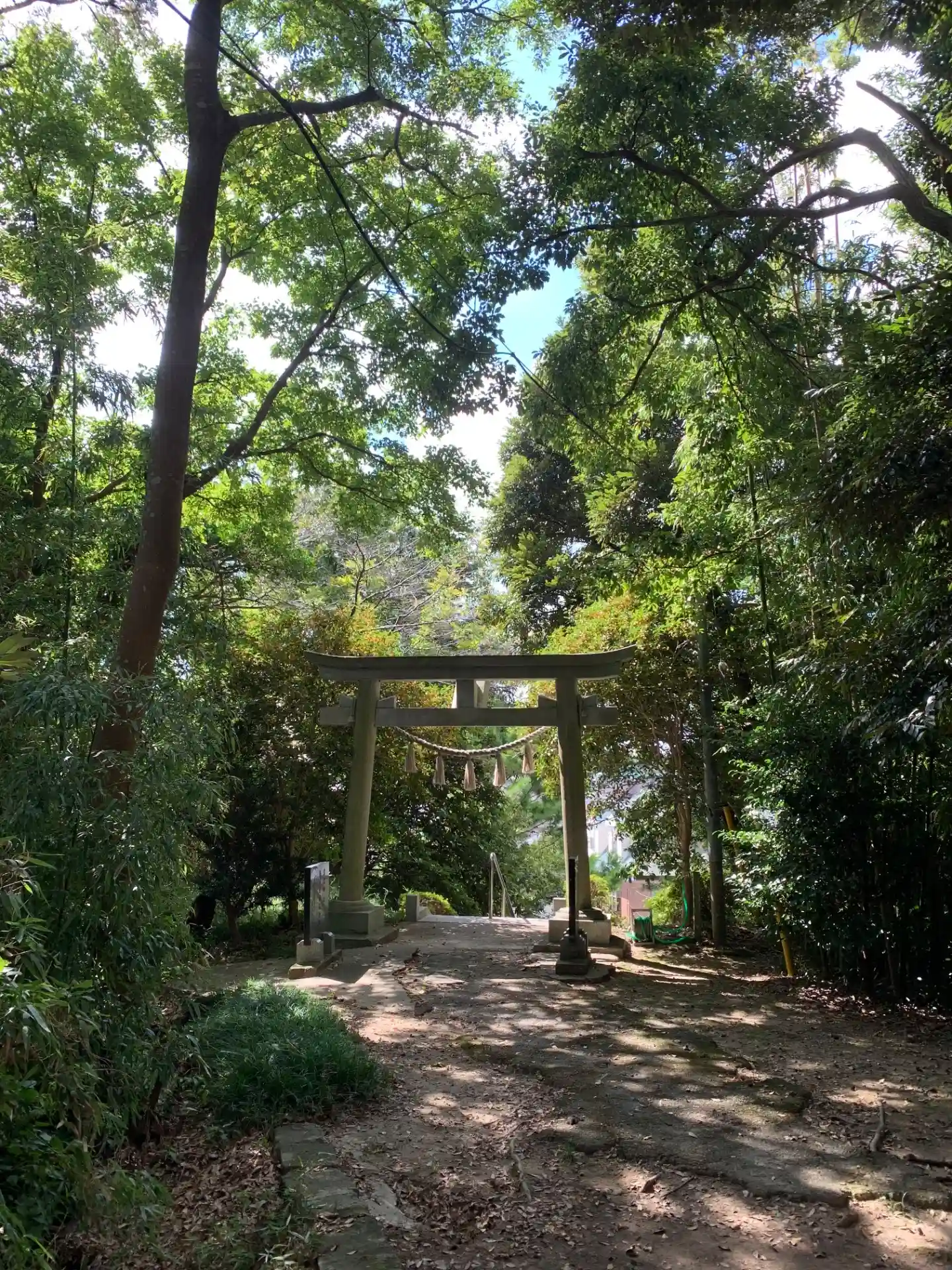 住宅街の中ですが雑木林に囲まれた素敵な場所です。参道には天満宮や見晴らしスポットがあります。