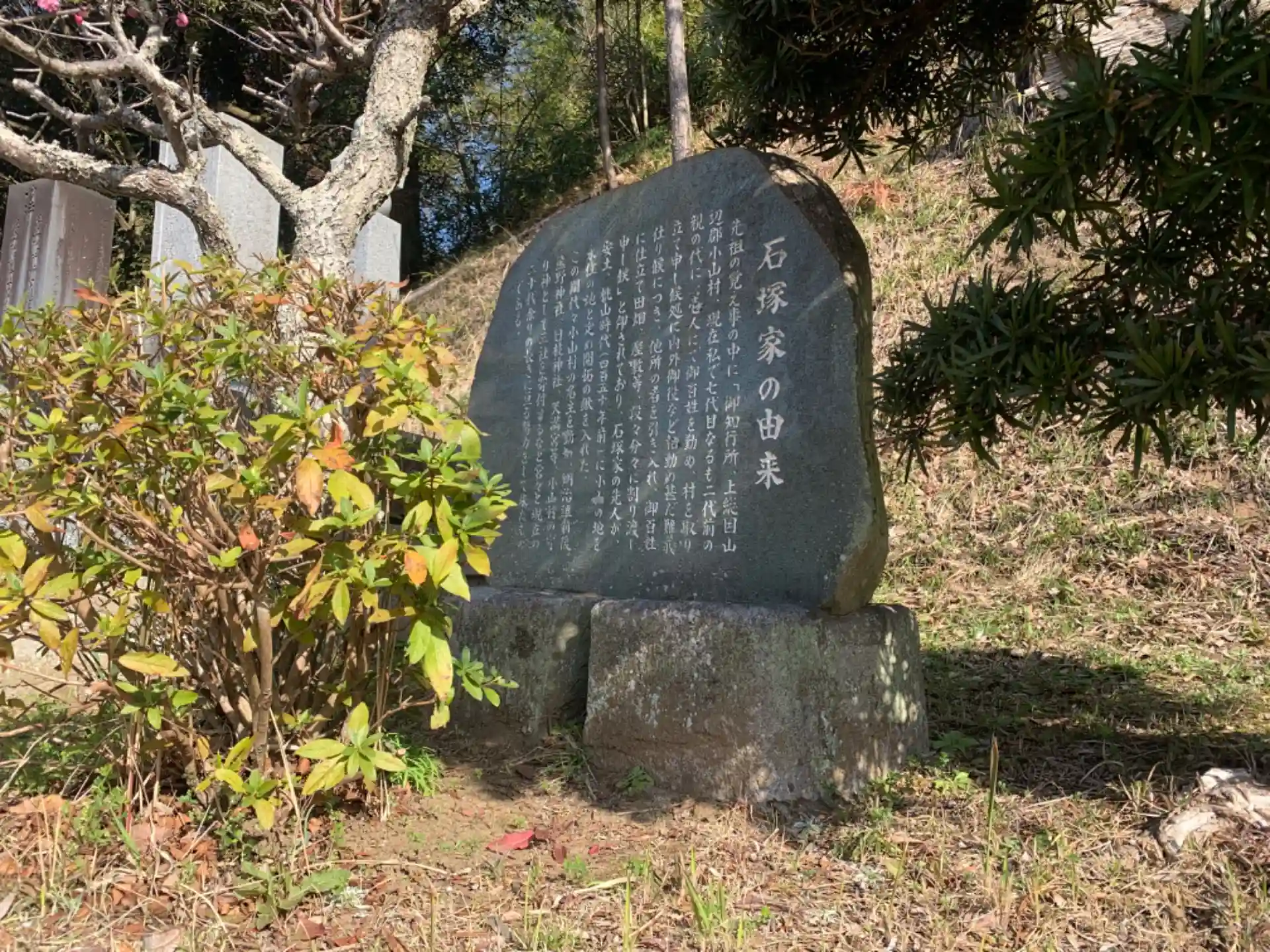 付近の墓地にある墓碑によると、明治時代に熊野神社や天満宮とともに石塚家が勧請したことがわかります。