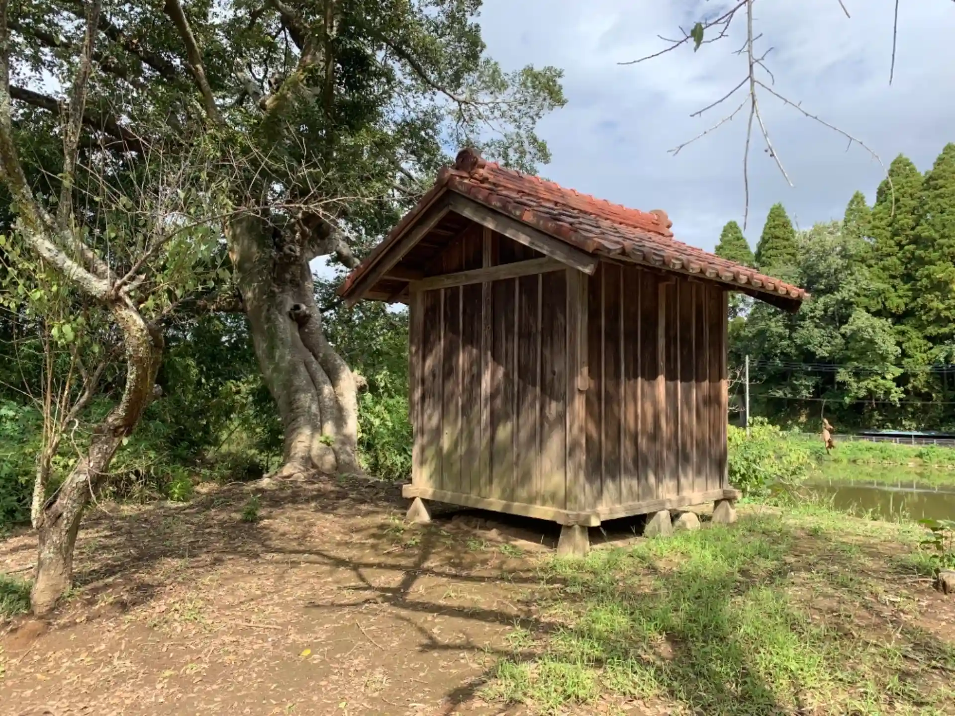 堰のほとりに建つ小さな神社。