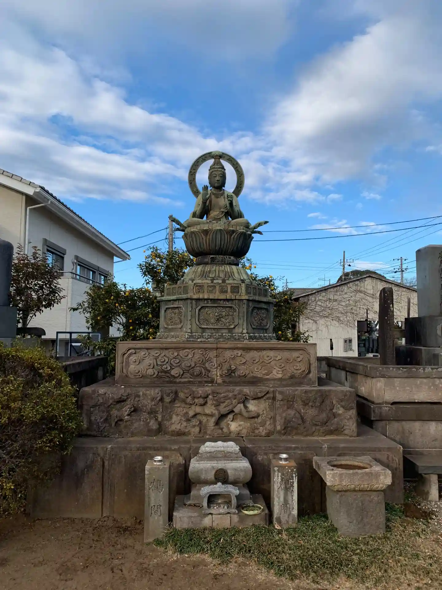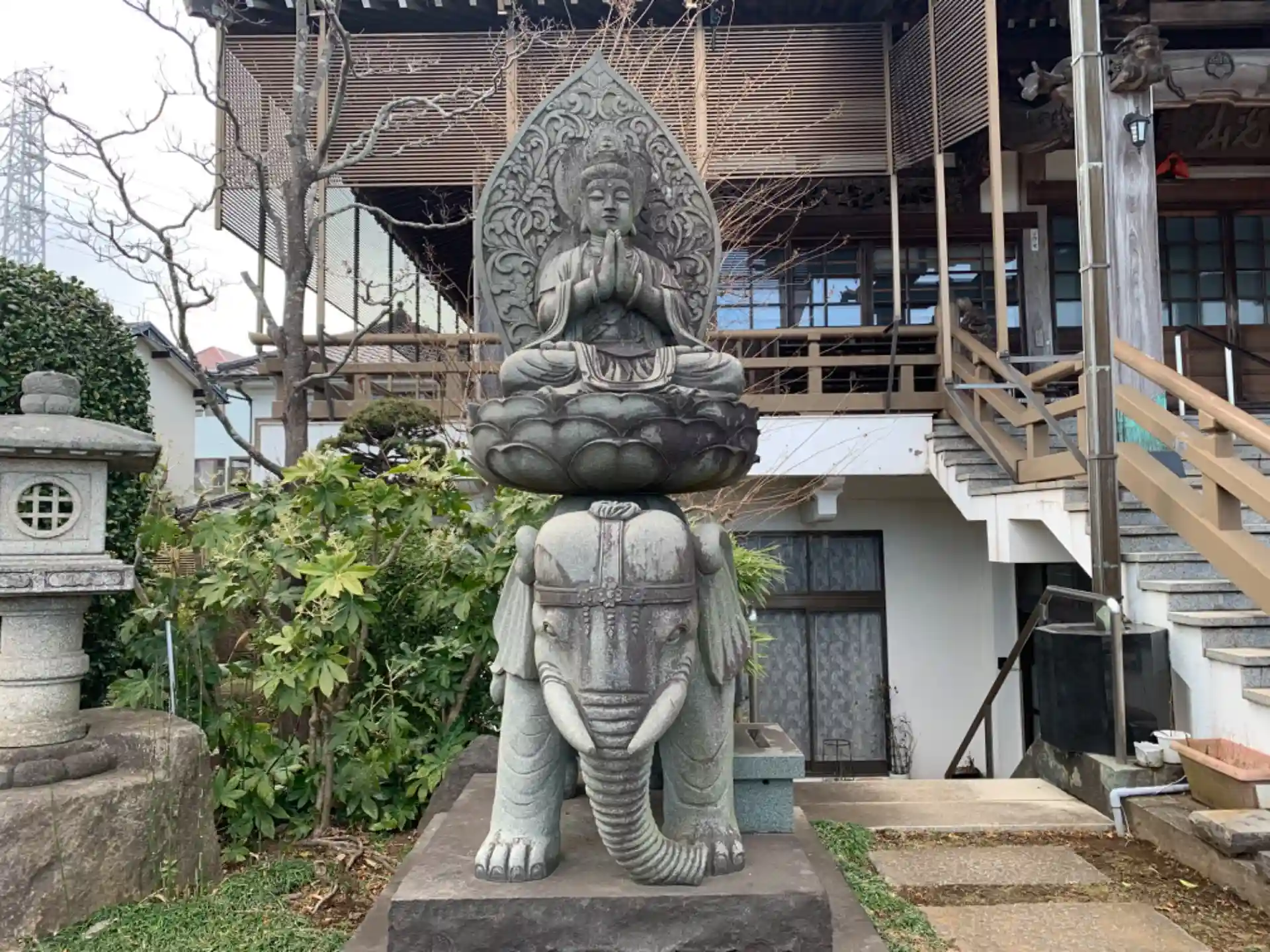 現代的な大きな本堂があり、像と獅子に乗った一対の仏像が目を惹きます。