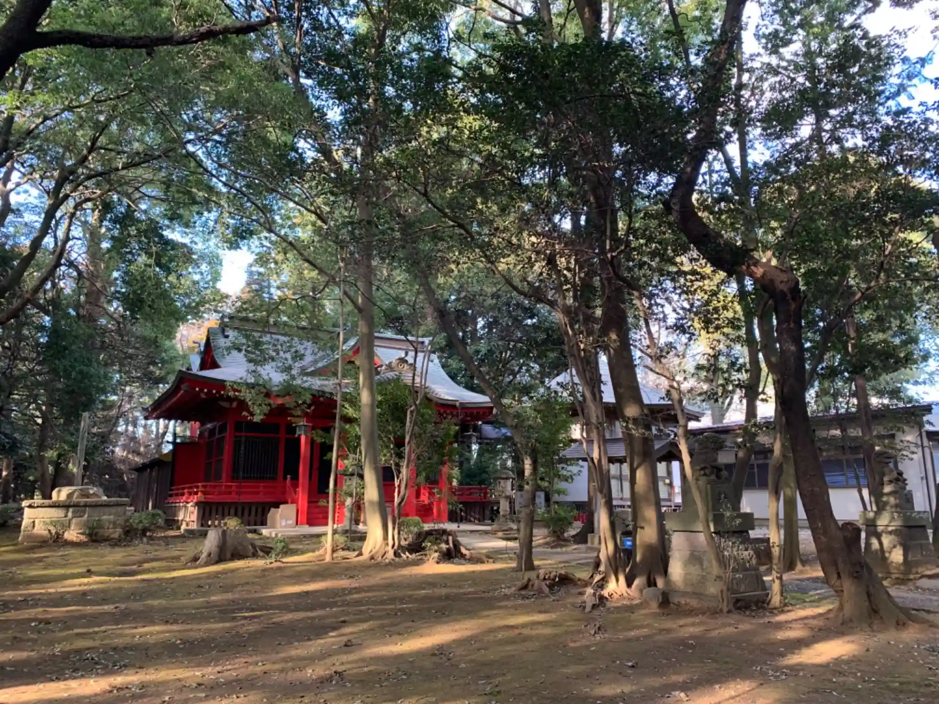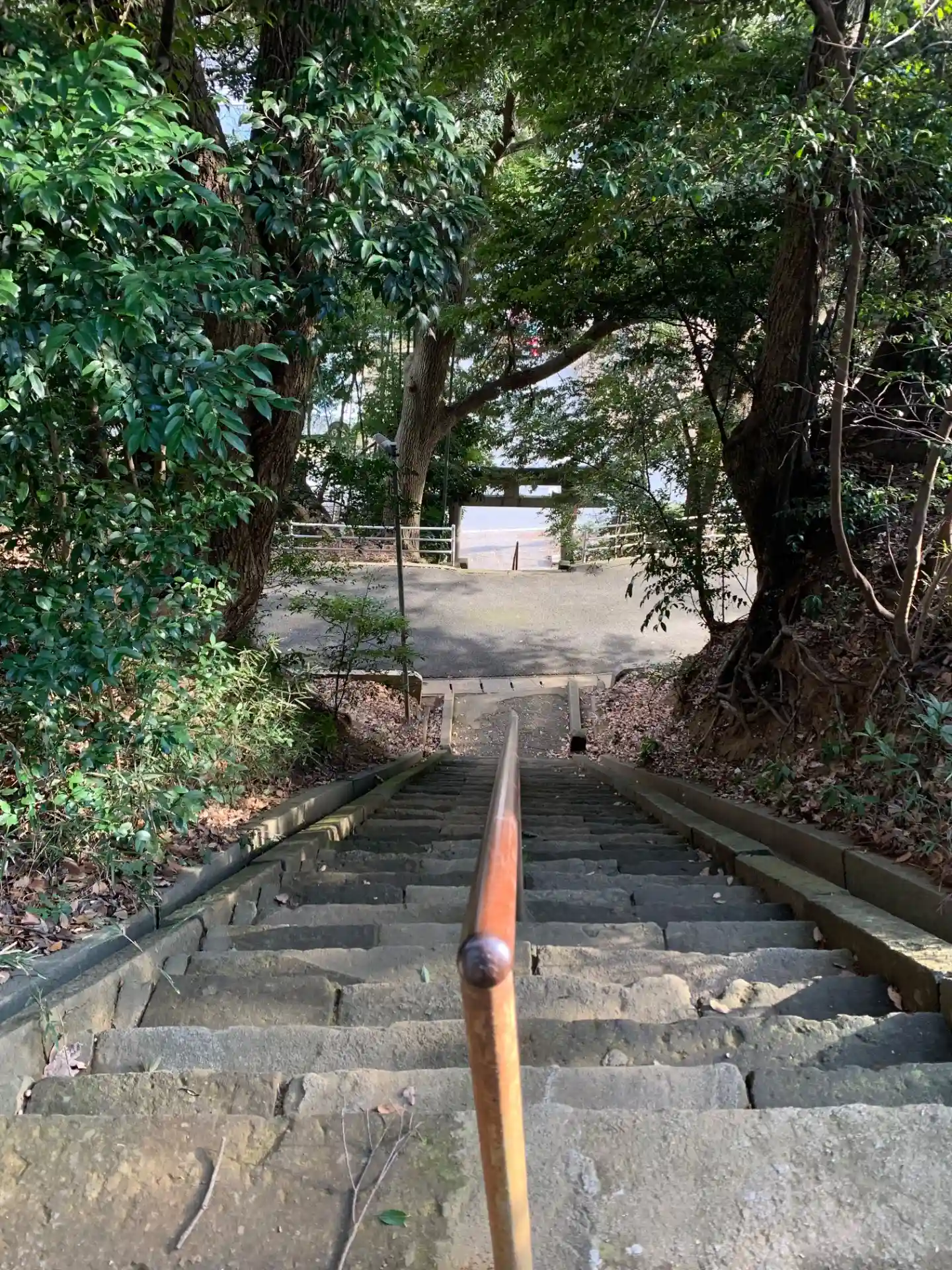 参道の石段が中学校へ登る坂道に分断されている面白い立地の神社。