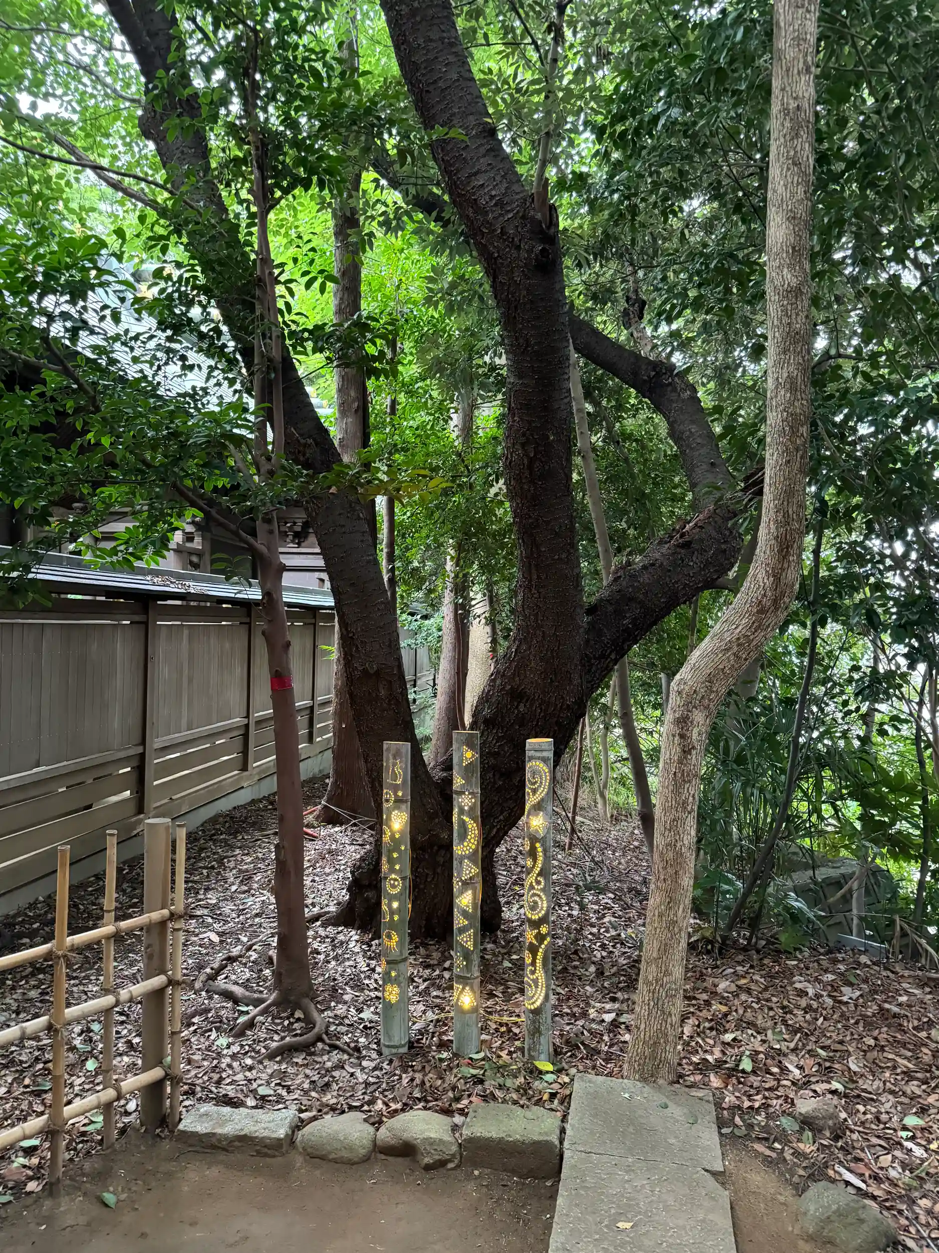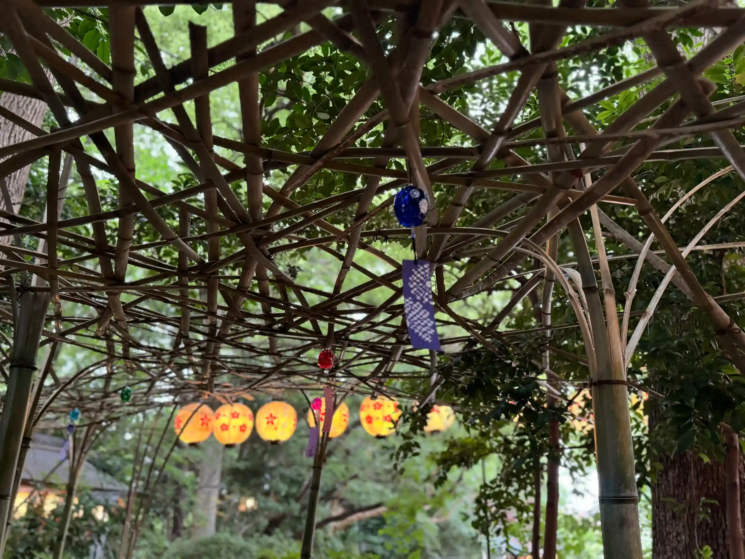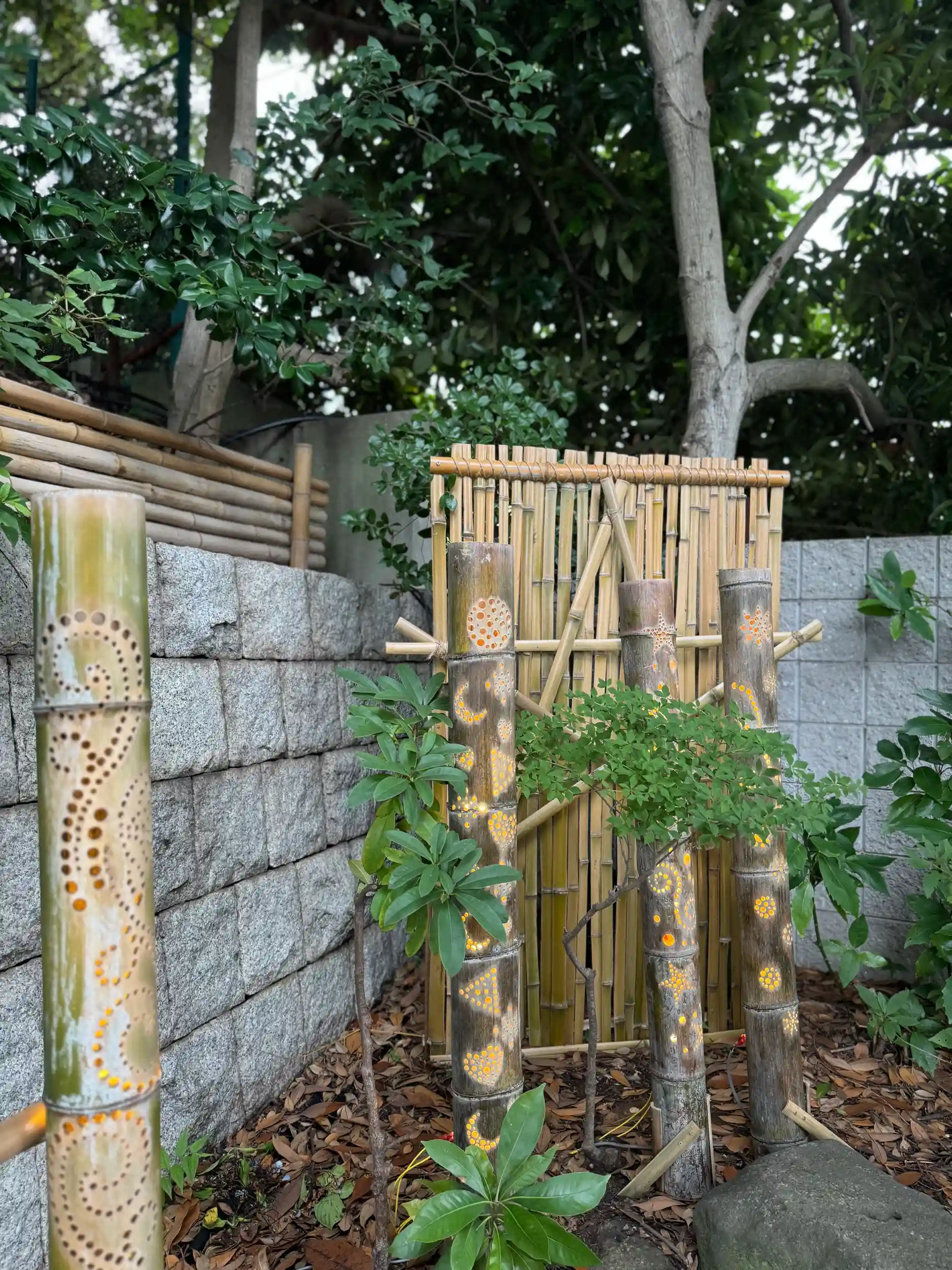 灯籠や提灯、竹細工に灯りが灯って温かい光が、素晴らしい