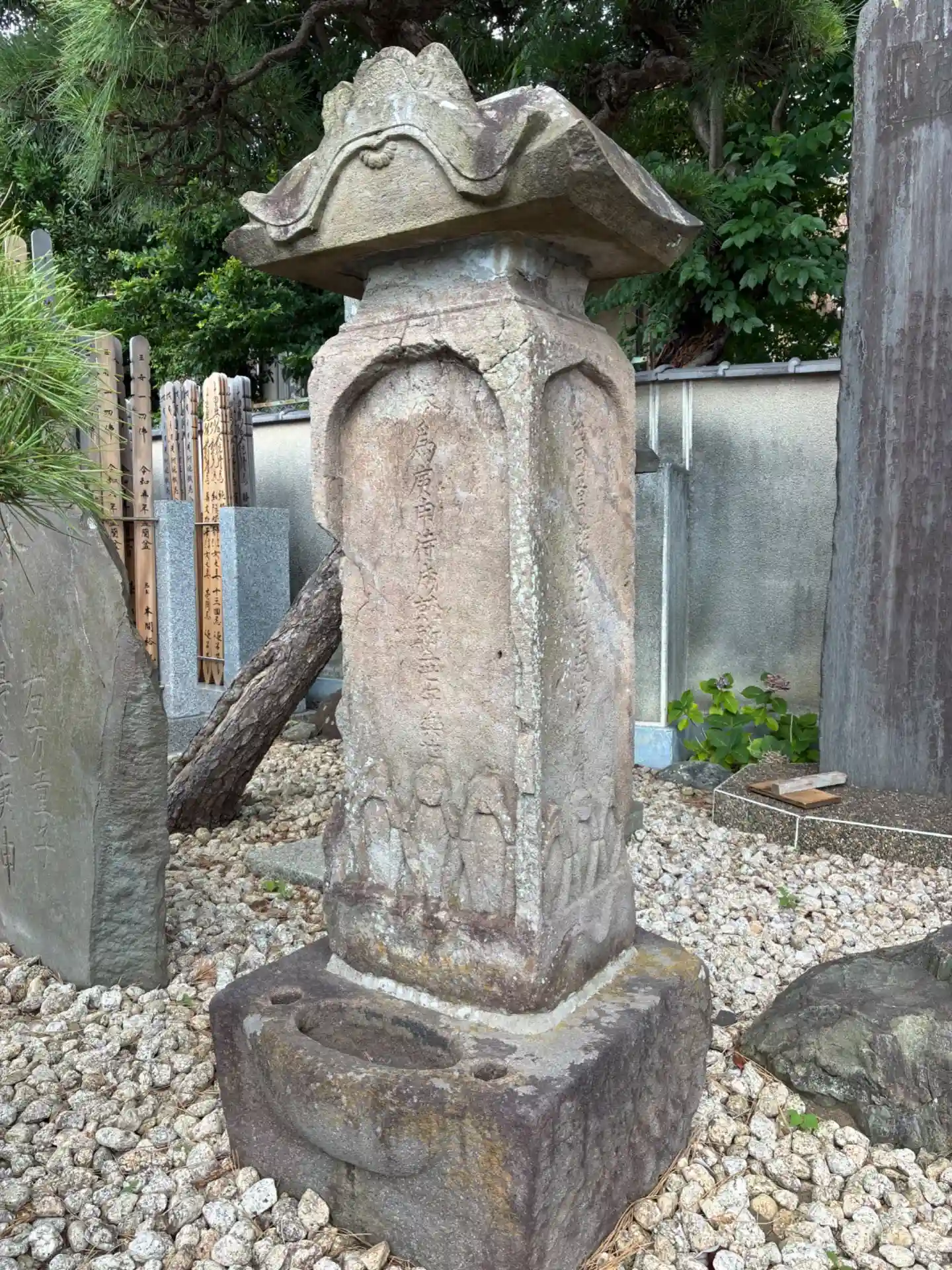 房州往還沿いにある雑貨屋の脇から入ったところにあるお寺。無縁仏の片隅に古そうな宝篋印塔が見られます。