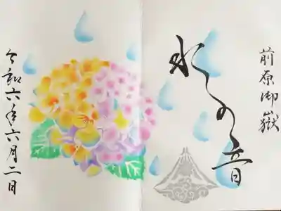令和六年6月の御朱印、水の音。紫陽花の花と雨しずくの絵