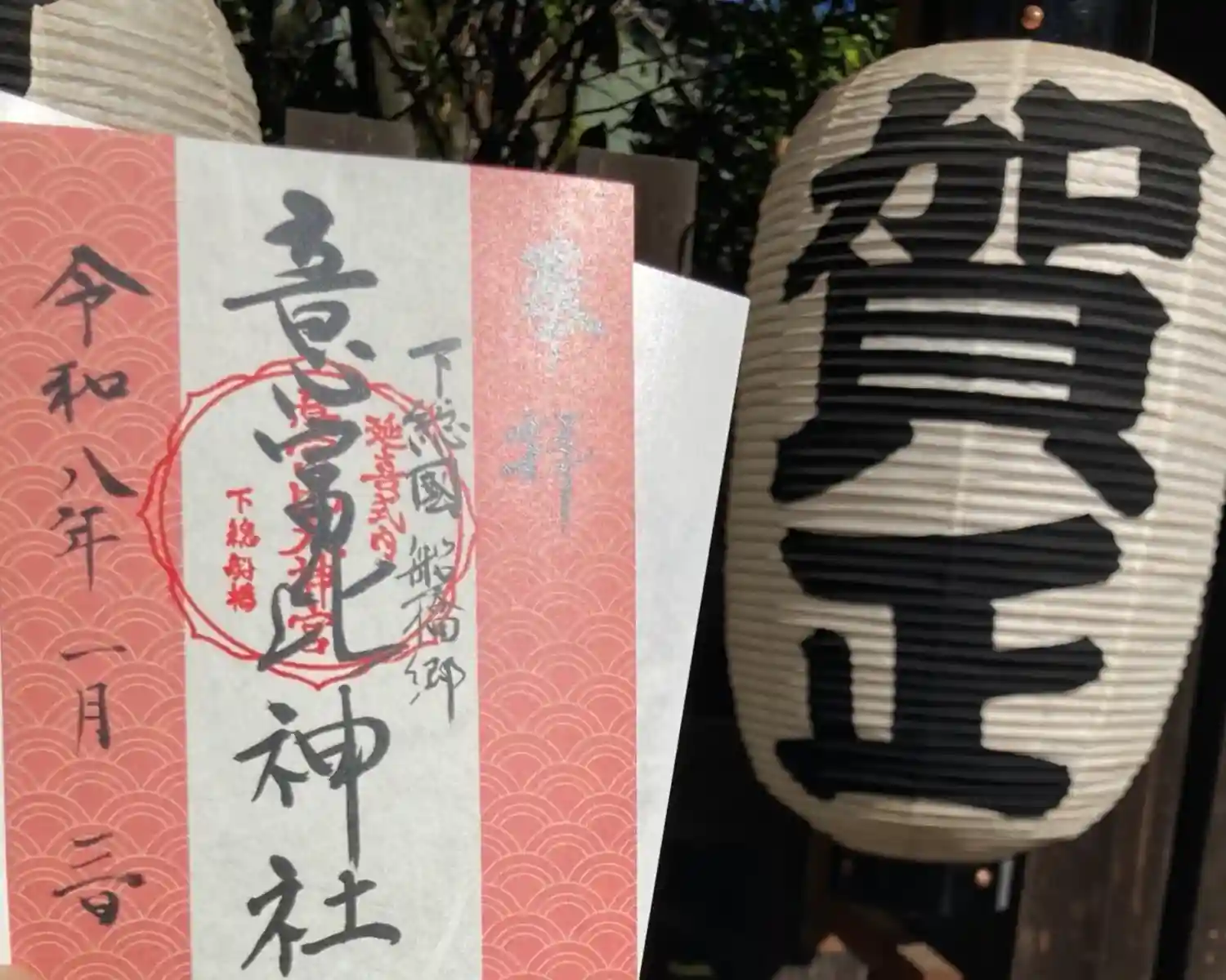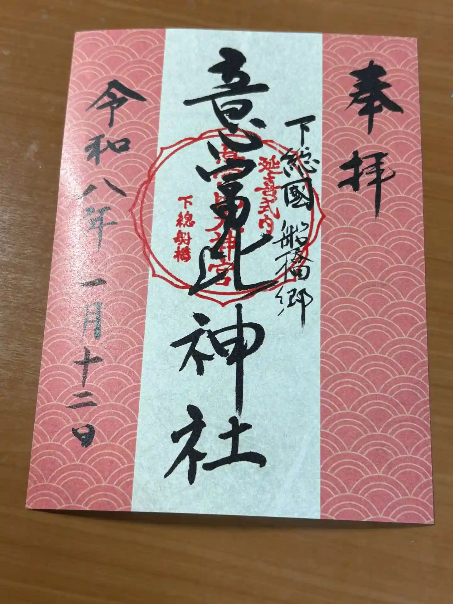 | 御朱印 | あり 右に下総國船橋郷と書かれ、真ん中に延喜式内意富比田井神宮下総船橋の印が入った御朱印です。