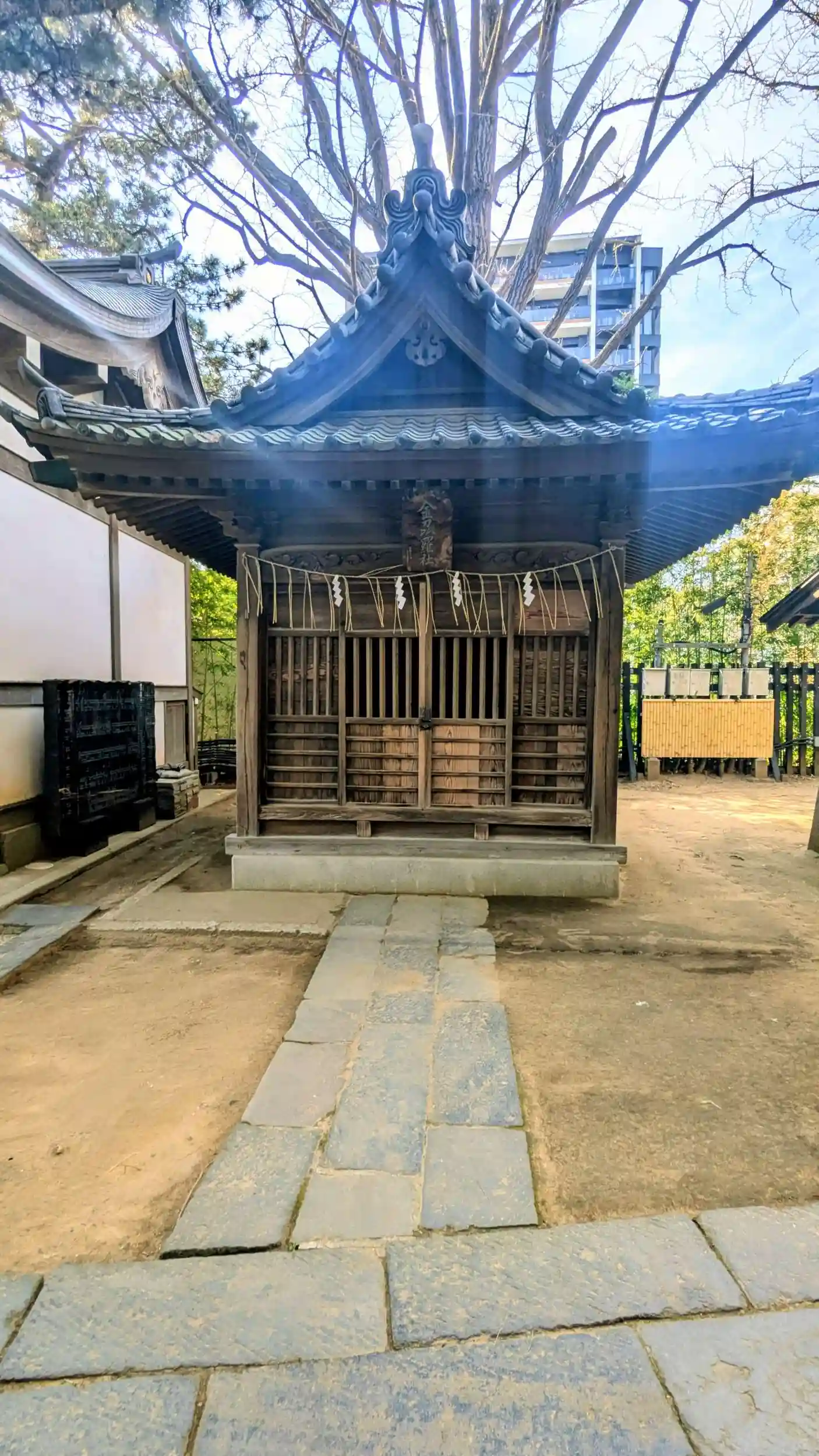 背の高い建物の中に、神輿が二基納まっています。この神輿自体が神社そのもので、神様は常にこの神輿にお鎮まりになっています。大きさもさることながら揉み方も珍しいこの神輿の勇姿は、七月のお祭りで観ることが出来ます😊