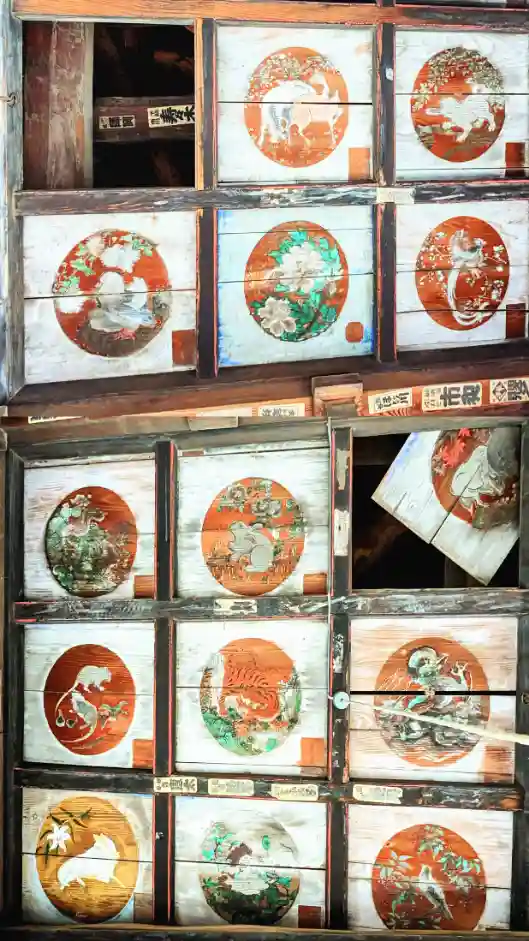 堂内の天井画は故児玉輝彦氏による百人一首が岩絵具によって鮮やかに描かれています。