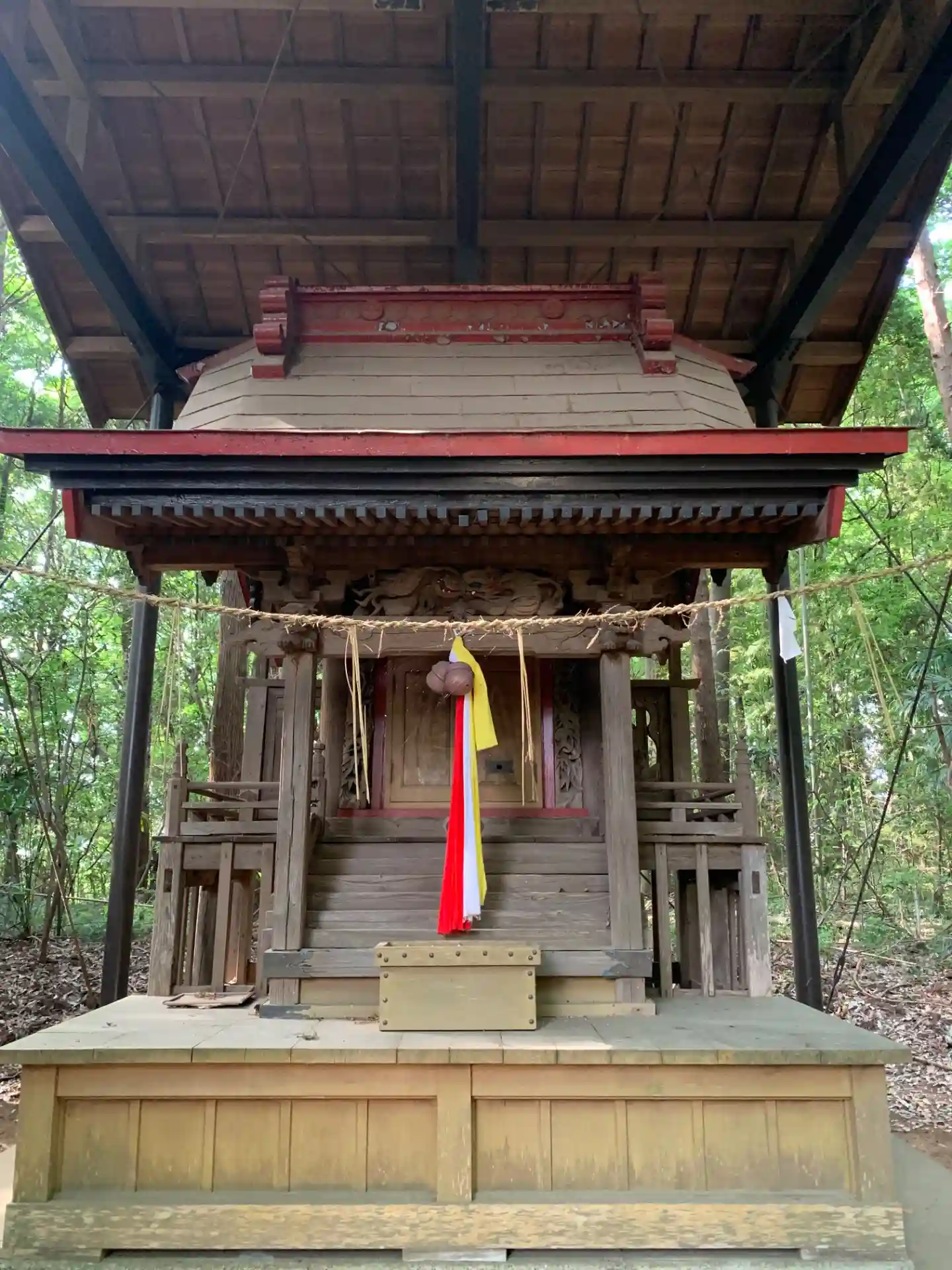 元寺院の集会所の隣にある神社。雑木林に囲まれた爽やかな空間です。胴羽目彫刻は祭神である菅原道真が題…