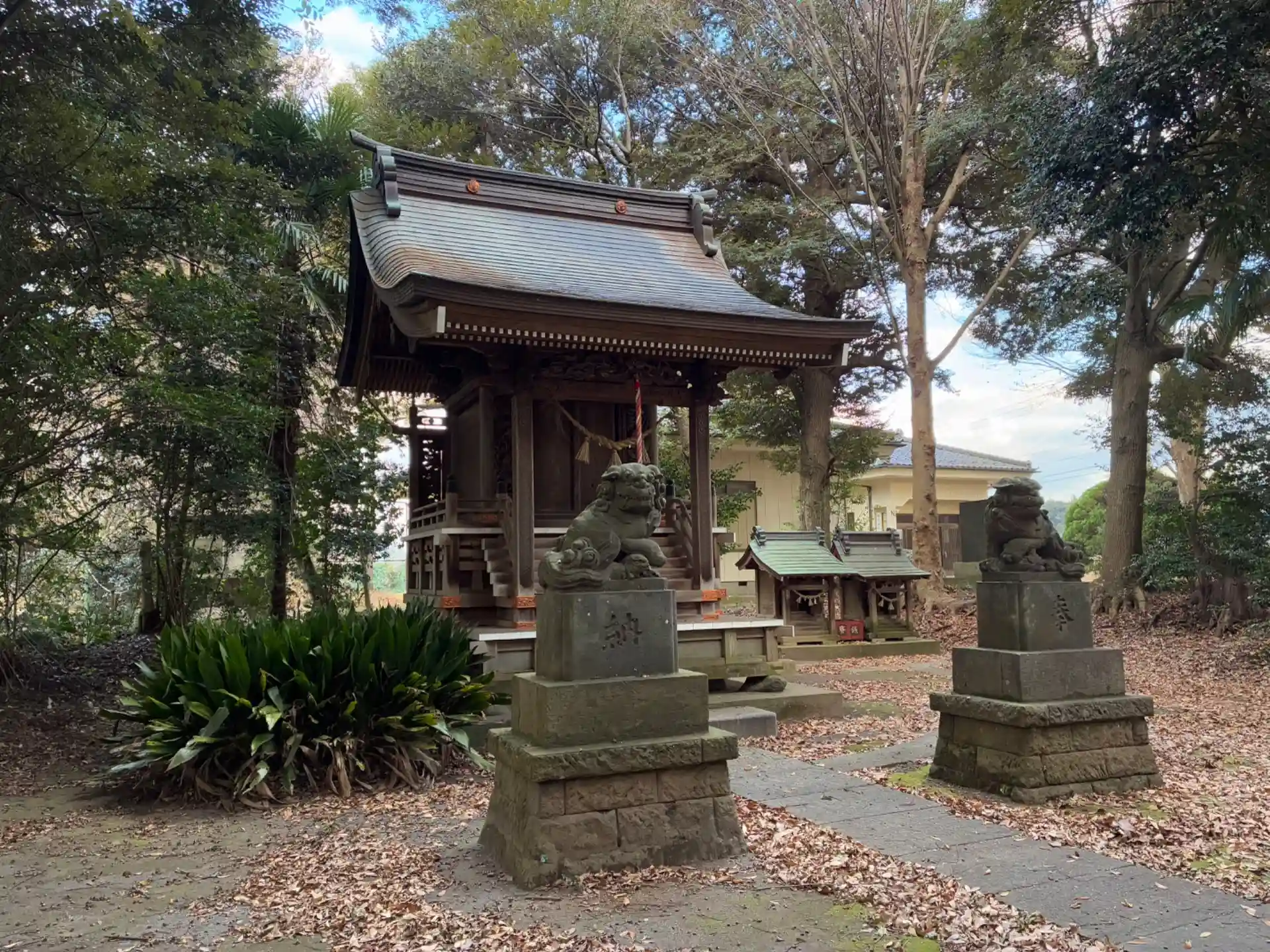 神々廻村の鎮守。表に見える建物の裏に本殿と狛犬があります。