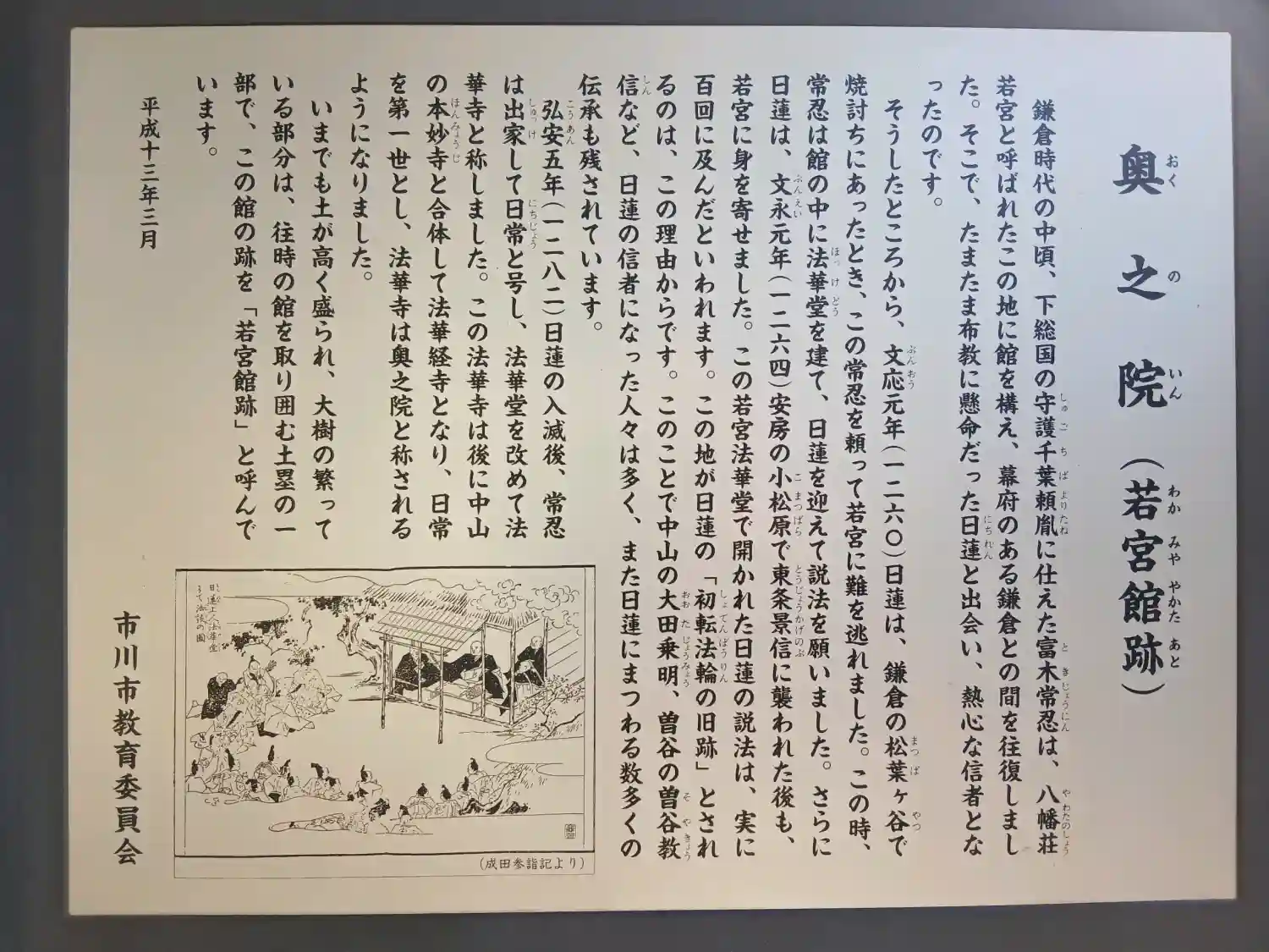 鎌倉時代の中頃、下総国の守護千葉頼胤に仕えた富木常忍(ときじょうにん)は、八幡荘若宮と呼ばれたこの地に館を構え、幕府のある鎌倉との間を往復しました。そこで、たまたま布教に懸命だった日蓮と出会い、熱心な信者となったのです。