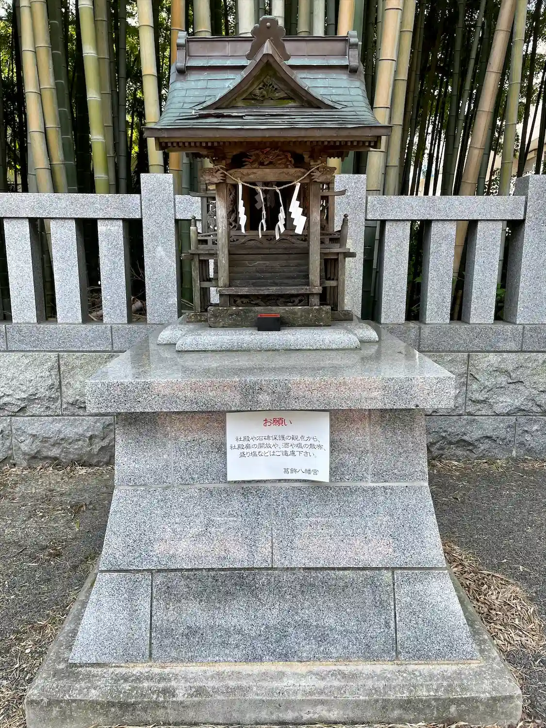 玉垣で仕切られた約300坪の竹藪で、「足を踏み入れると二度と出てこられなくなる」という神隠しの伝承とともに有名で、その一角に葛飾八幡宮の境外末社・不知森神社が祀られている。