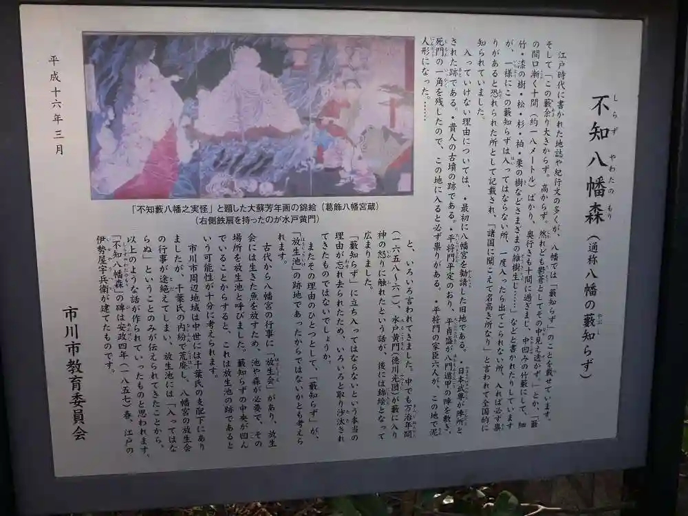 JR総武線の本八幡駅から葛飾八幡宮に向かう途中に、一区画だけ、うっそうとした竹林がありました。玉垣で囲われ、鳥居が立っています。市川市教育委員会の案内板によると「不知八幡森(しらずやわたのもり)」、通称「八幡の藪知らず」と呼ばれる場所だそうです。入れば必ず祟りがある場所として、江戸時代から全国によく知られた場所で、中でも水戸黄門がここに立ち入って神の怒りに触れた、という話は錦絵になって広まったそうです。