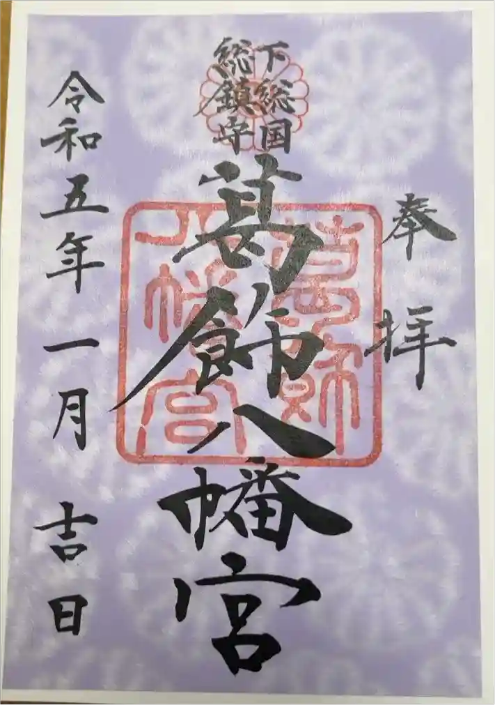 御創建は平安朝の昔、寛平年間(889-898)宇多天皇の勅願により下総の国総鎮守八幡宮として御鎮座、以来歴朝の御崇敬篤く、代々の国司・郡司をはじめ、国民の信仰深く、下総の国における葛飾文化、八幡信仰の中心となり、なかでも平将門の奉幣、源頼朝の社殿改築、太田道灌の社壇修復後、徳川家康の御朱印地社領52石の寄進等その尊信は篤いものでありました。また、御主神応神天皇の御事蹟により、文教の祖神、殖産興業、殊に農業守護の神として近郊の信仰をあつめております。毎年9月15日の御例祭日より20日まで、広大な境内で催される農具市の盛況さは、古来より関東一と称されています。