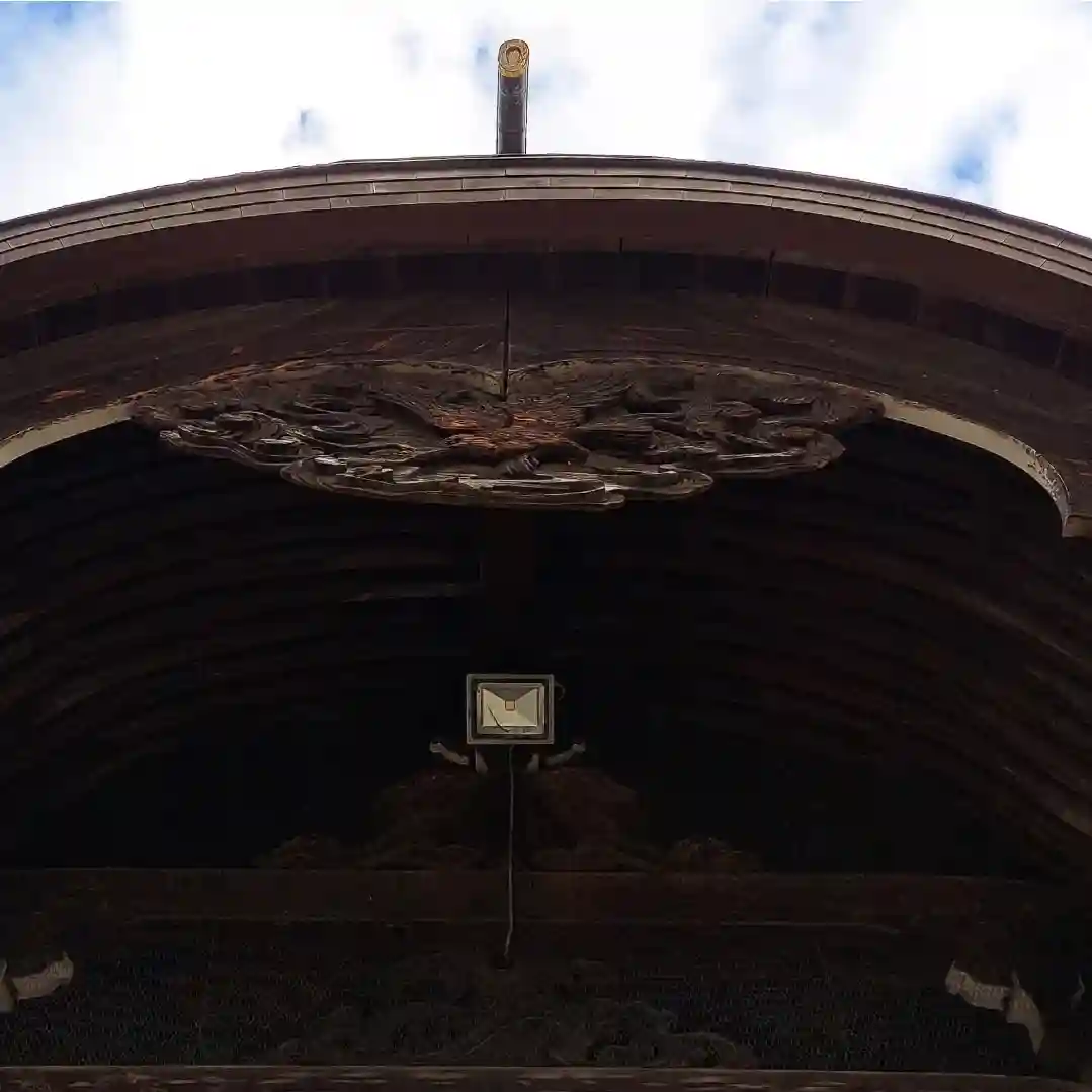 和様、木造単層切妻の構造をもち、屋根はかつて茅葺きでしたが、現在は銅葺き。三間一戸、丹塗りされており、桁行10.36メートル、梁間4.45メートルです。(平成14年8月、塗り替え修復工事竣工)