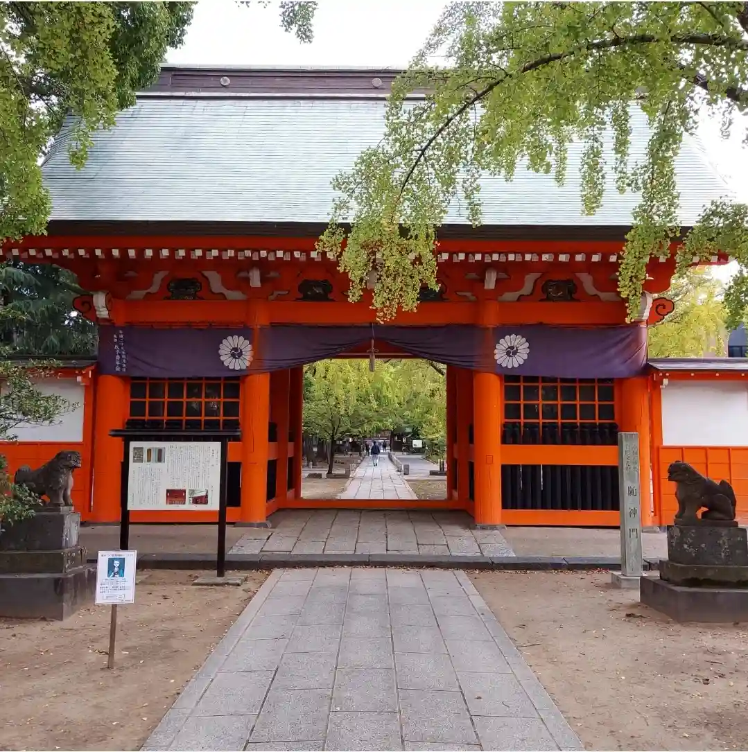 明治維新以前は、天台宗上野寛永寺の末寺、八幡山法漸寺の仁王門でしたが、神仏分離によって当宮の随神門となりました。両裾に位置する随神(右大臣•左大臣)のある場所には仁王像がありましたが、現在は行徳の徳願寺に遷されています。