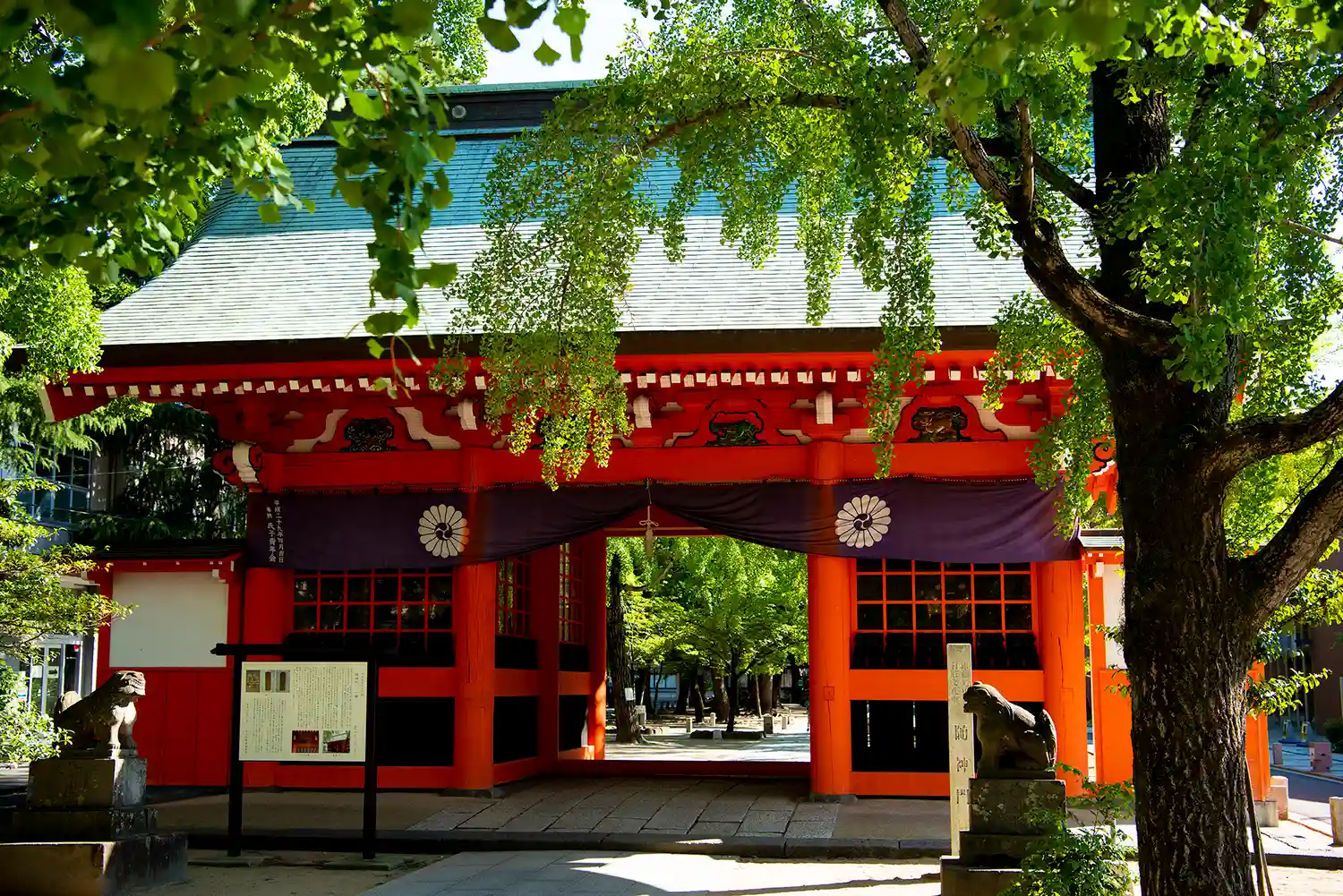 朱色の隋神門のとイチョウ