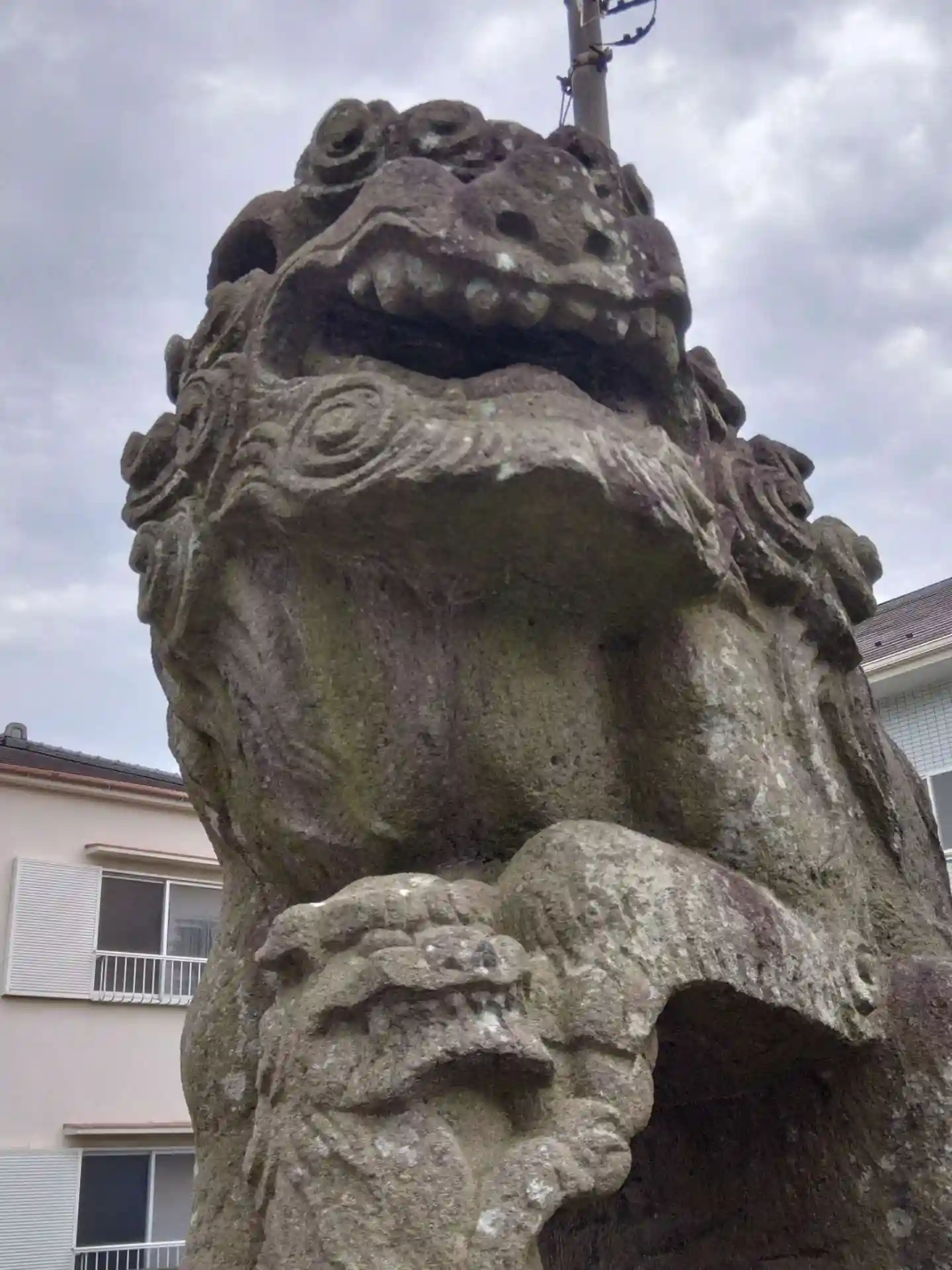 もう一方は、片足を上げて子供の狛犬さんが支えています。