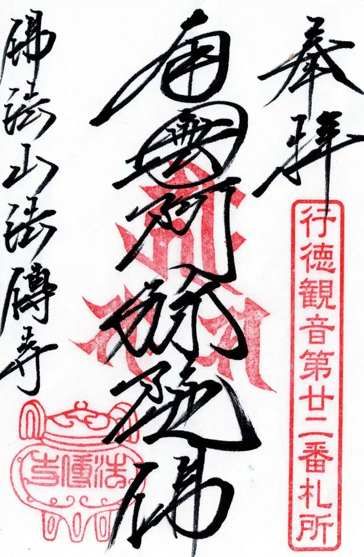 参拝した折、境内では法事の準備で慌ただしくされており、お忙しい様子でしたが、幸運にも書き置きの御朱印を拝受することができました。中央には本尊である「南無阿弥陀佛」の文字が力強く躍り、背景には阿弥陀如来を象徴する梵字の朱印、そして右側には「行徳観音第廿二番札所」であることを示す鮮やかな朱印が押されています。行徳三十三観音霊場を巡る尊い証をいただくことができ、感謝の気持ちでいっぱいになりました。