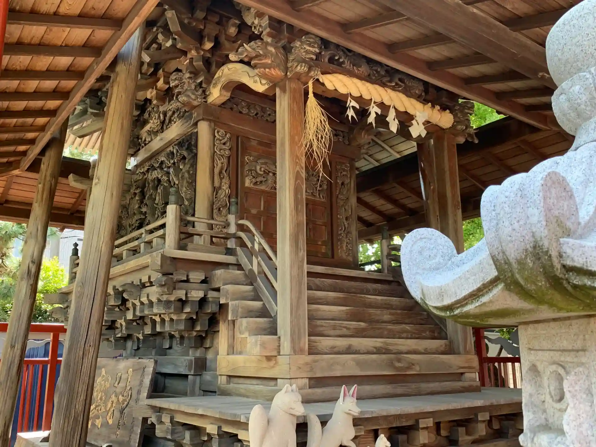 行徳街道に背を向けて建つ神社。境内には銀杏の巨木があります。本殿が見所で、立体的な彫刻を見学することができました。行徳街道に背を向けて建つ神社。境内には銀杏の巨木があります。本殿が見所で、立体的な彫刻を見学することができました。