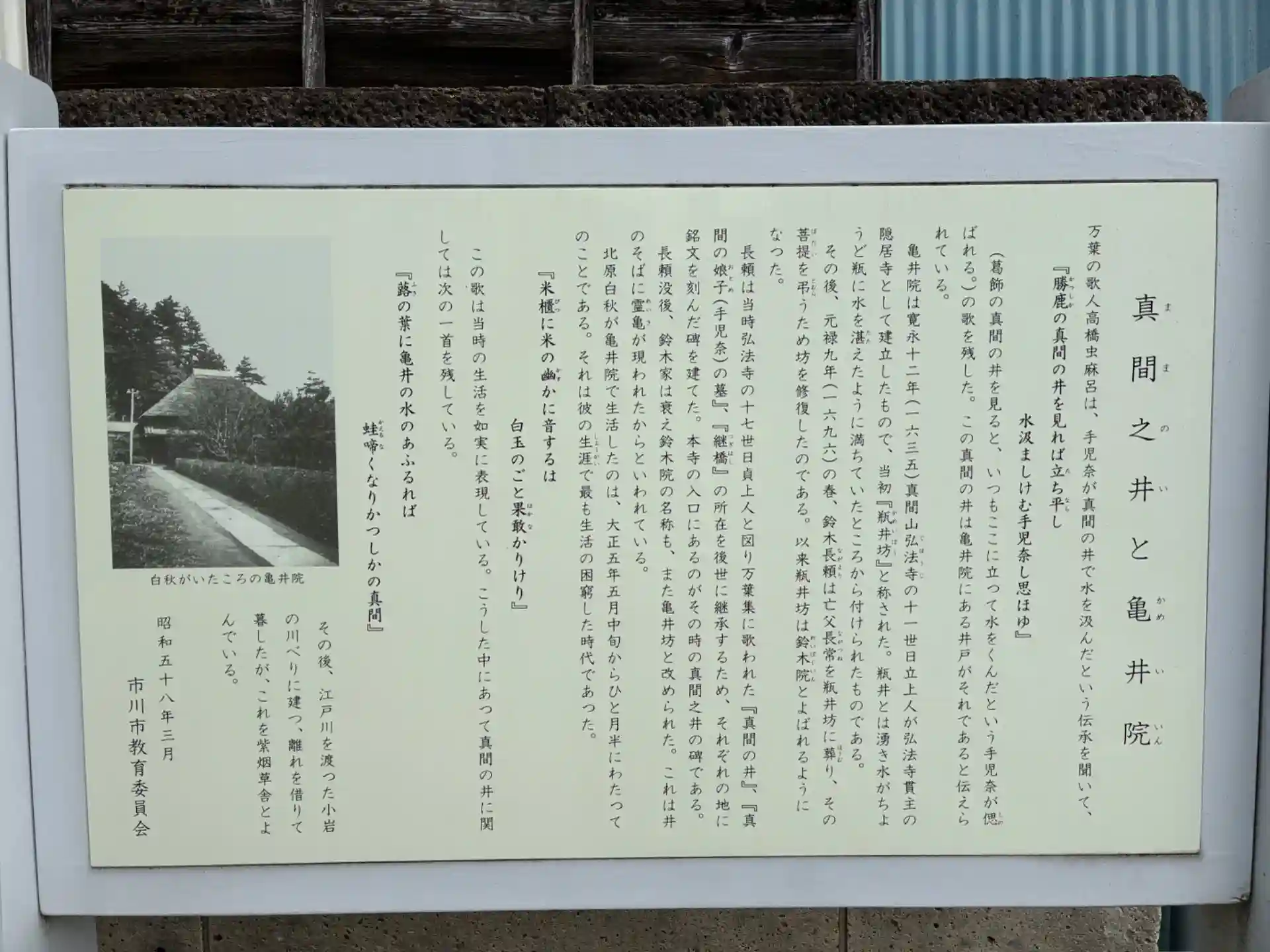 手児奈霊神堂の隣にあるお寺。手児奈がここの井戸で水を汲んだという言い伝えがあり、これを後世に残すために江戸時代に建てた石碑が残されています。