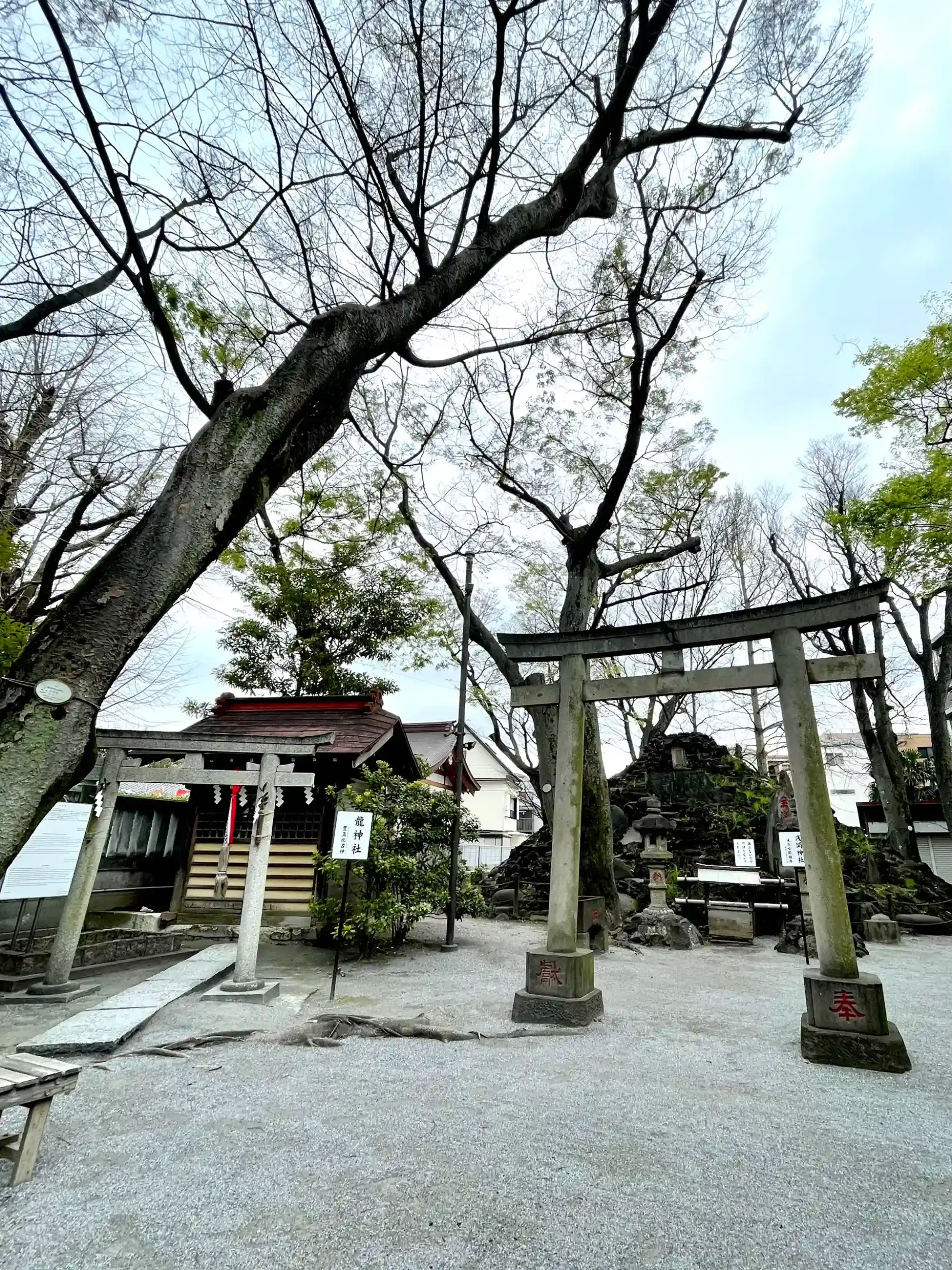 社務所が開く前に到着。先にお詣り&散策。入口の鳥居周辺にはまだ元気な桜(pic5)。中へ入り正面に拝殿(pic1,2)。左奥には境内社と富士塚(pic4)。そこまで進むと本殿(pic3)がよく見えます。