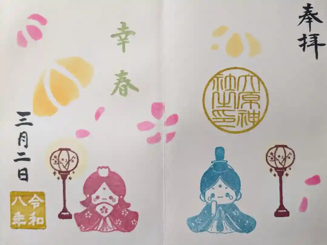 桜の花がデザインされた二面見開きの御朱印で、真ん中に桃ひらきの文字が入り、右面は真ん中に大原神社の印、上部に左三つ巴の神紋と下総國習志野の印、左面は真ん中に「開運 ご縁結び 大原神社」の文字が入ったお内裏様とお雛様のイラスト印が押されています。