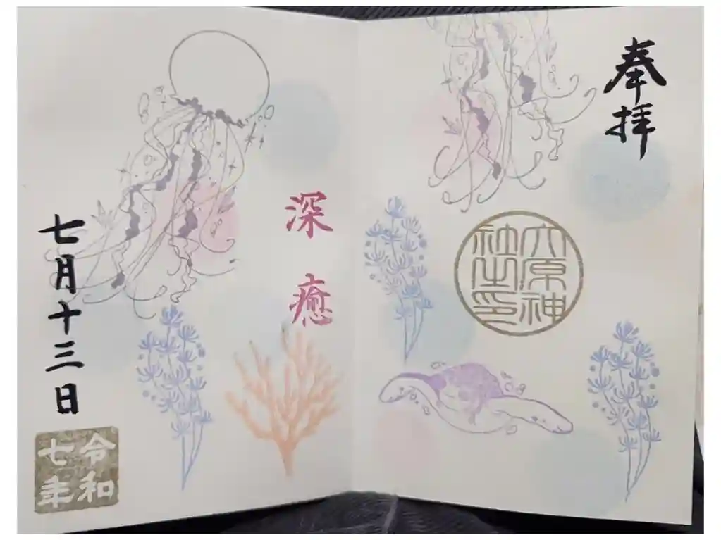 蒸し暑い盛夏のなか、水中をゆらゆらと泳ぐ金魚をモチーフとした涼を感じさせる御朱印で、真ん中に「大原神社 清涼の杜」の文字、左下に大原神社の印が押されています。