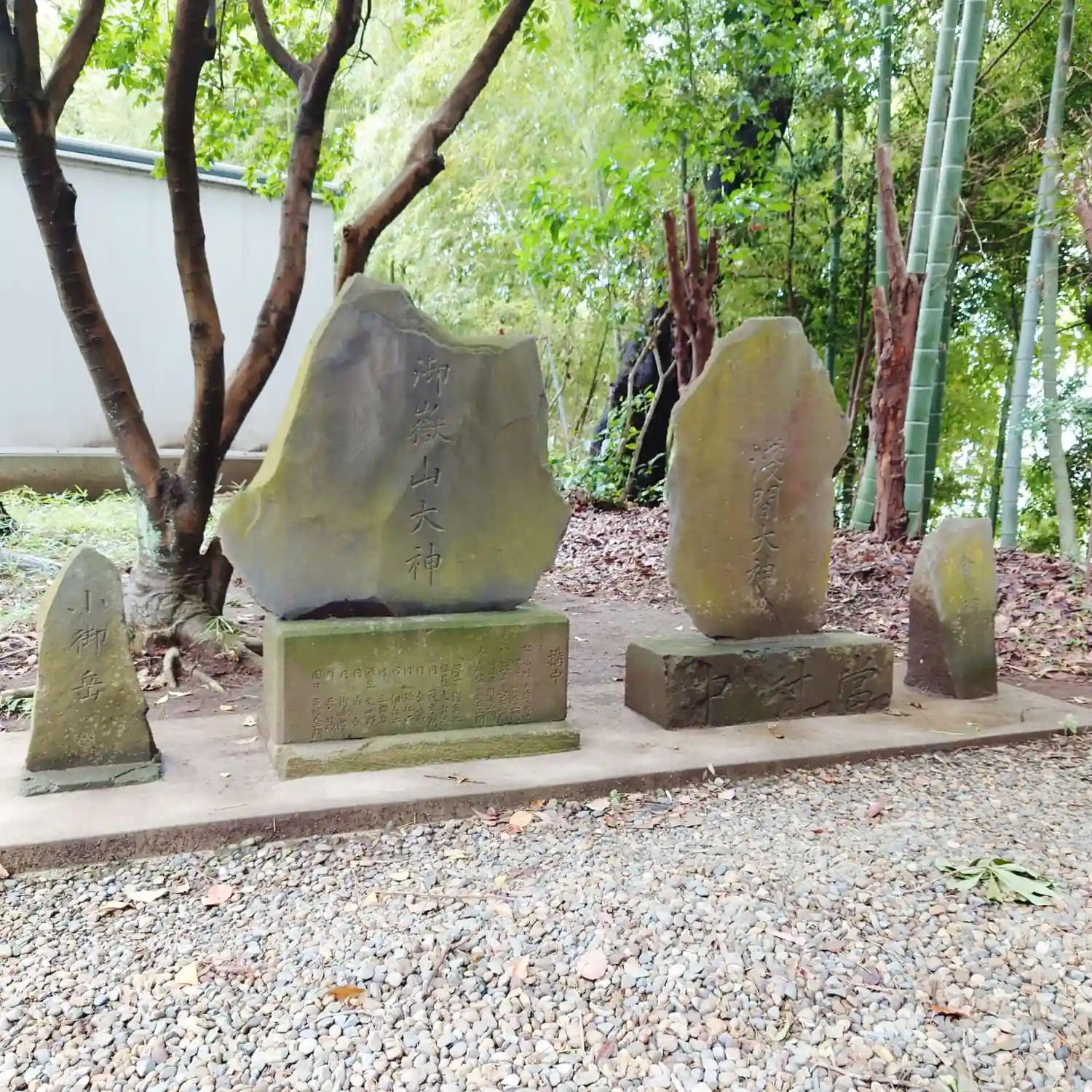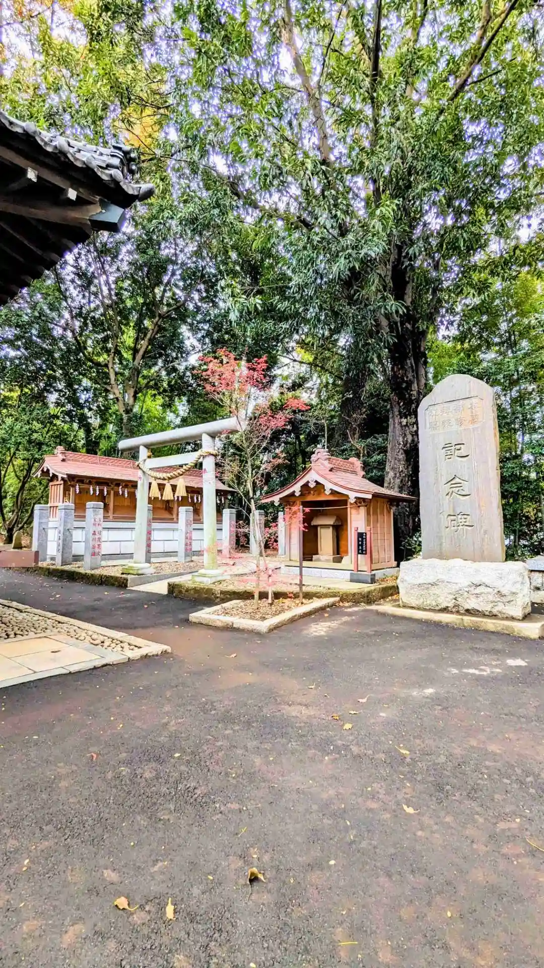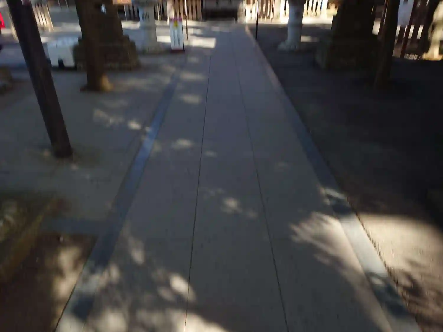 神社の敷石が歩道にはみ出しています。県道がきれいに整備される前はもっと長い参道だったのでしょう。