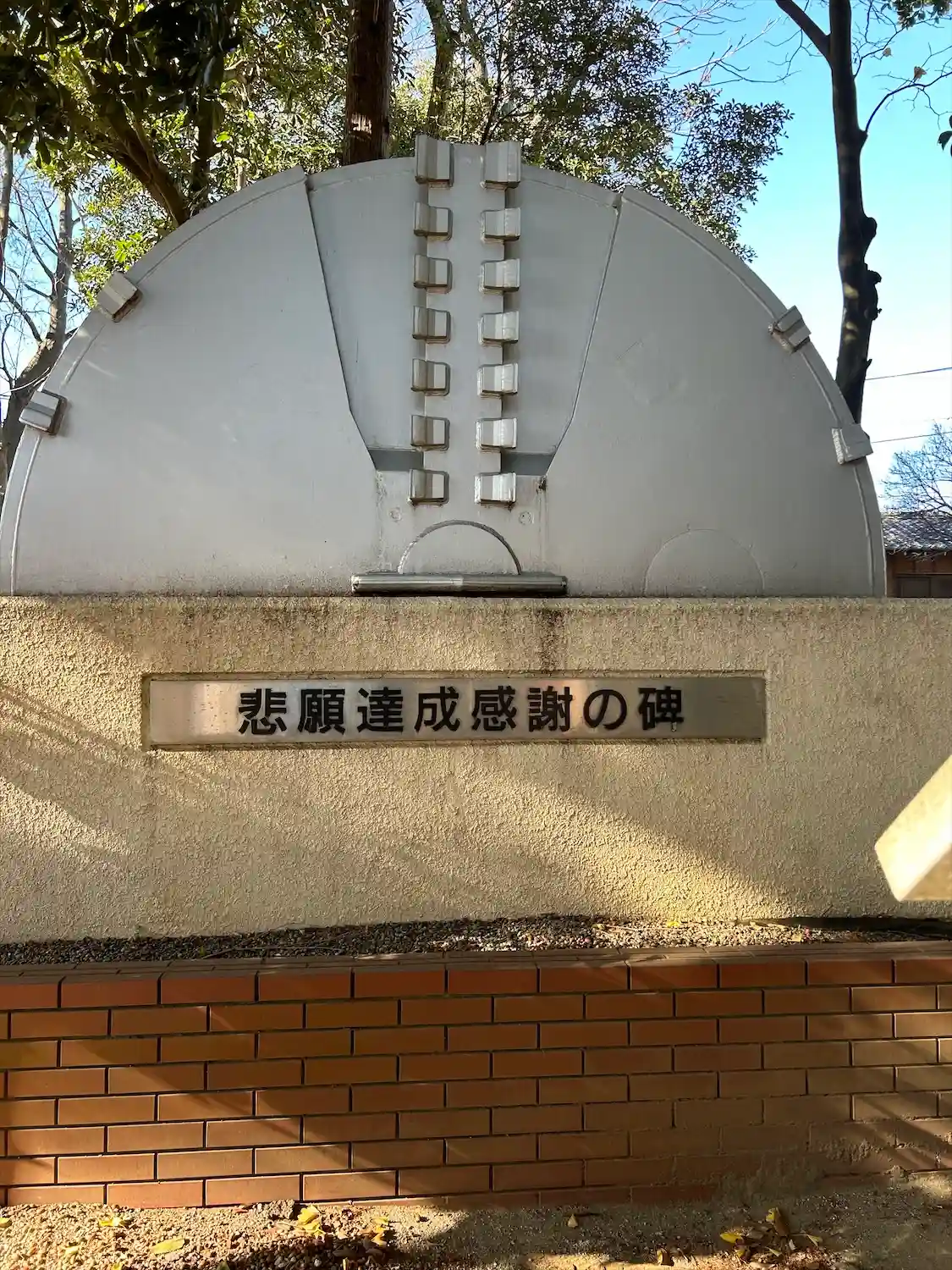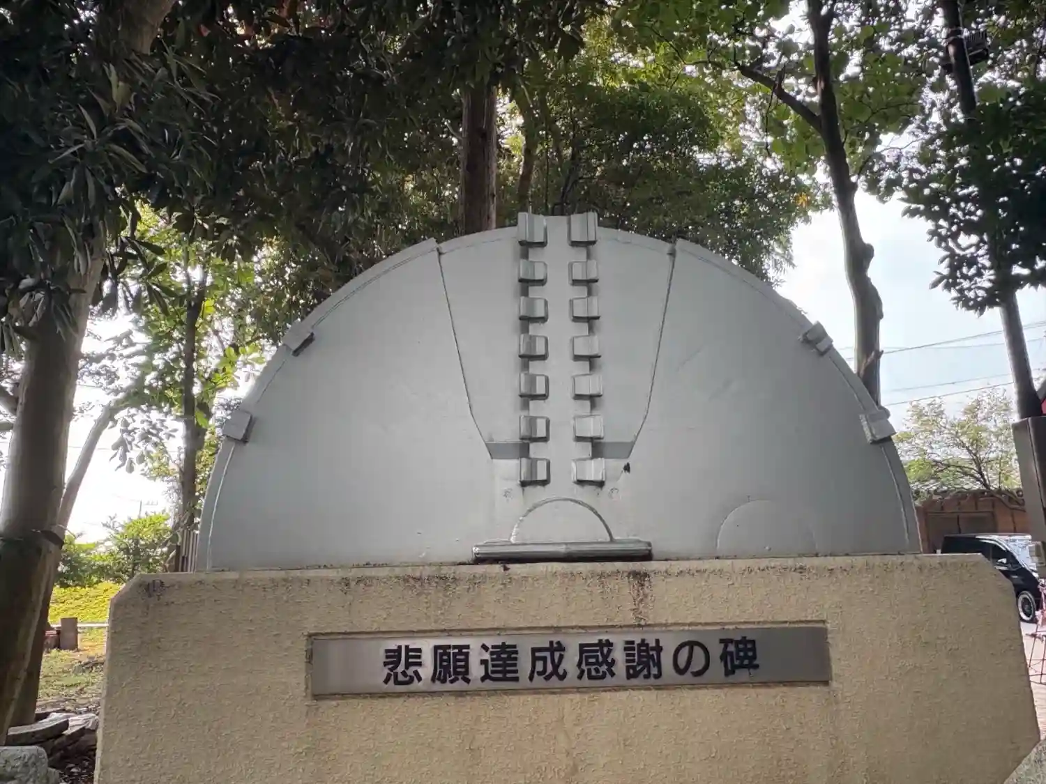 浜田川治水工事完成を記念し置かれた使用した掘削機の刃型を模した碑。