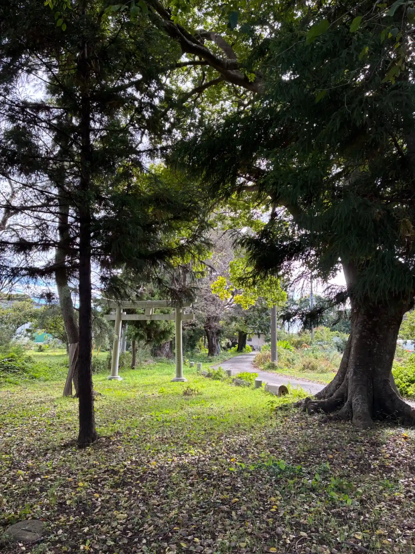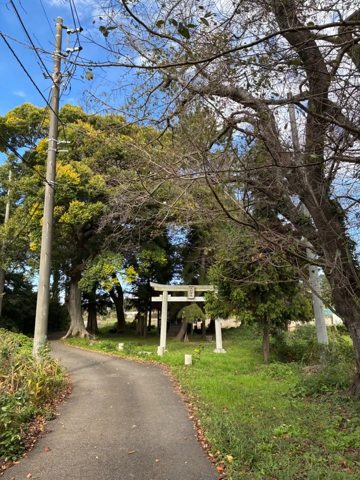 柏井村の鎮守。古い参道には草が生えていて、脇の車道からお参りできます。