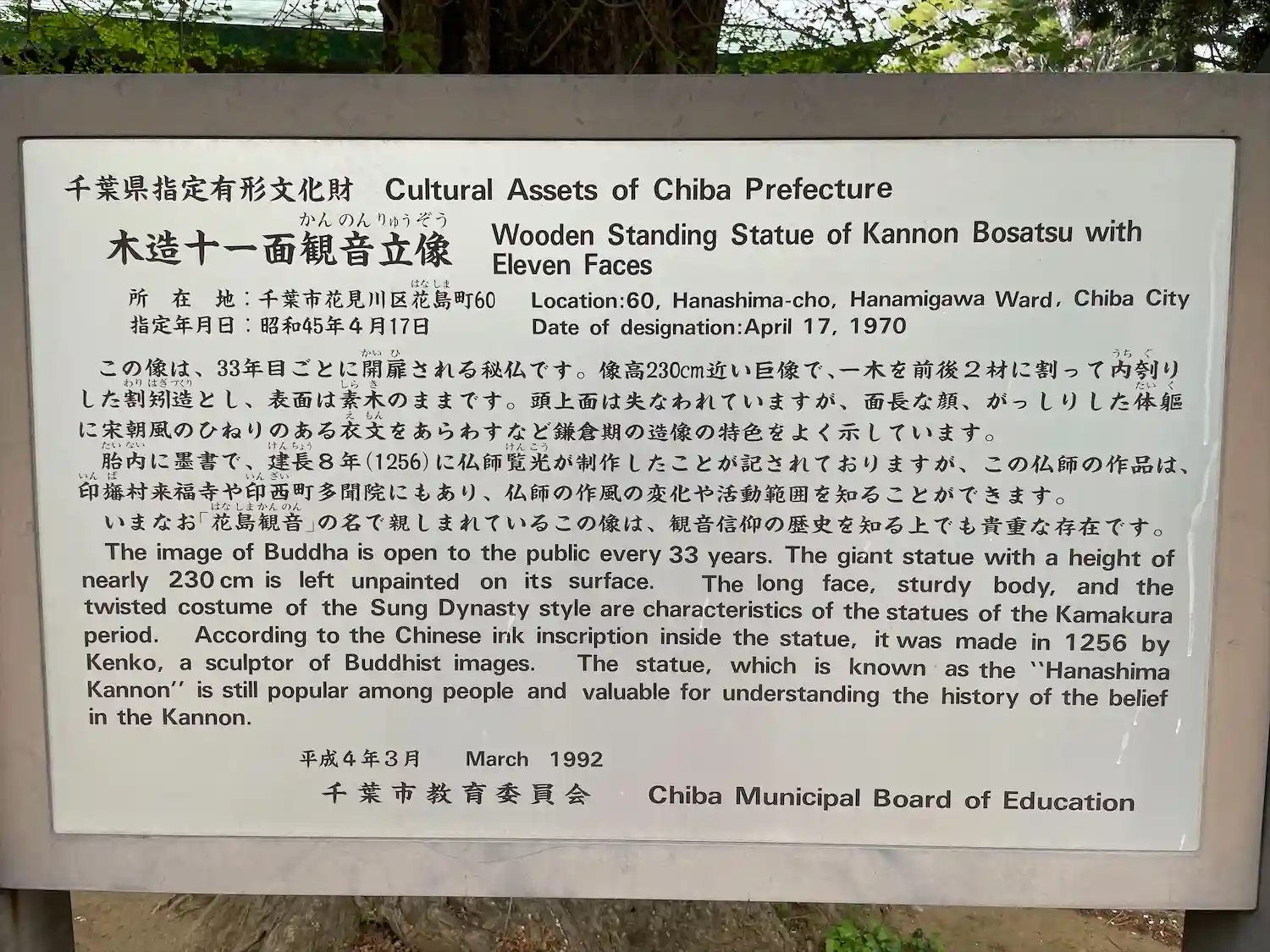 花島観音の名で親しまれている木造十一面観音立像は、33年に一度開扉される秘仏とのこと。