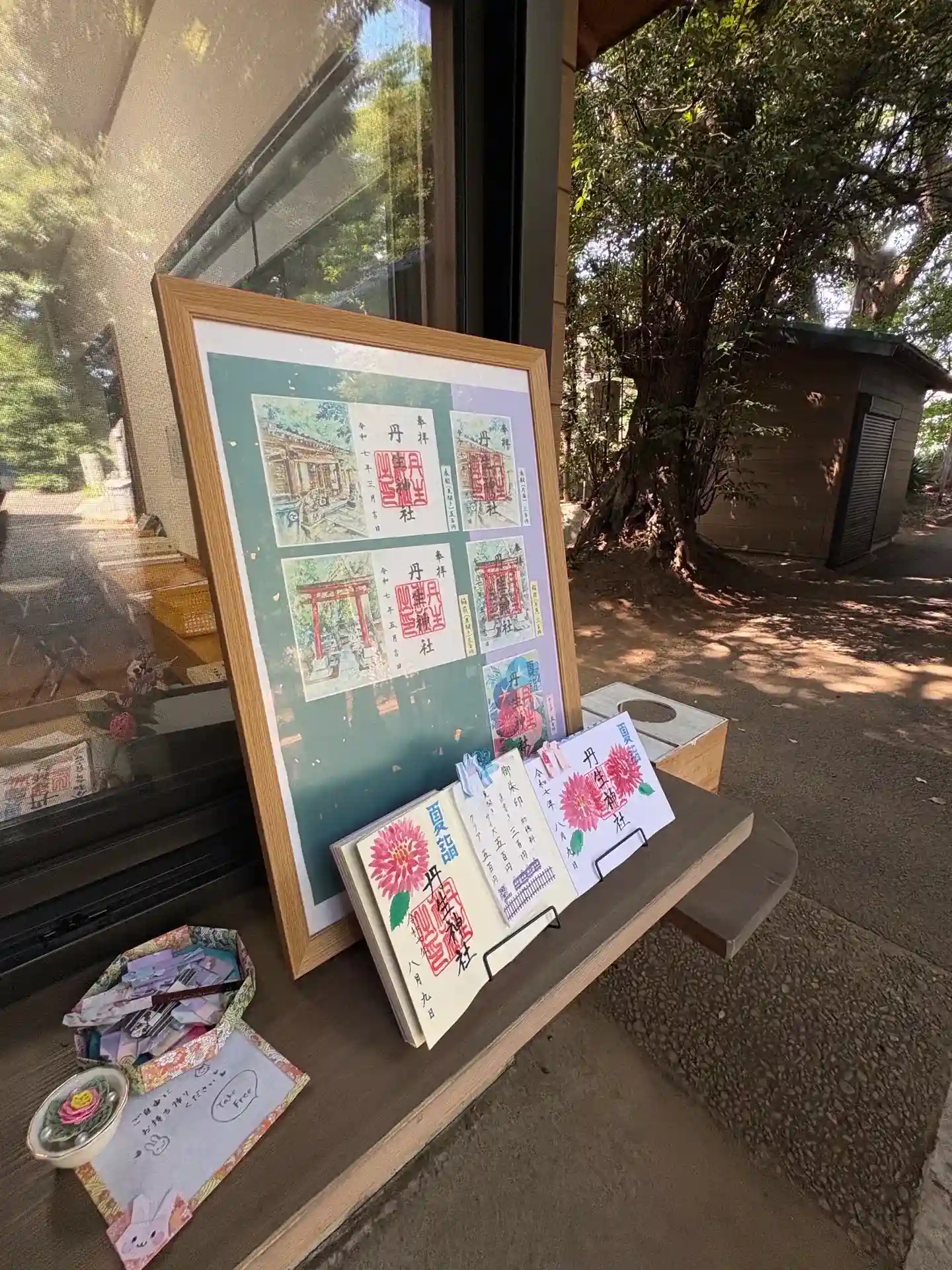私も社務所で御朱印をいただこうと、お願いしてみましたら、「今日は絵を描く方が帰ってしまって、書いてあるものはありますけれど?」