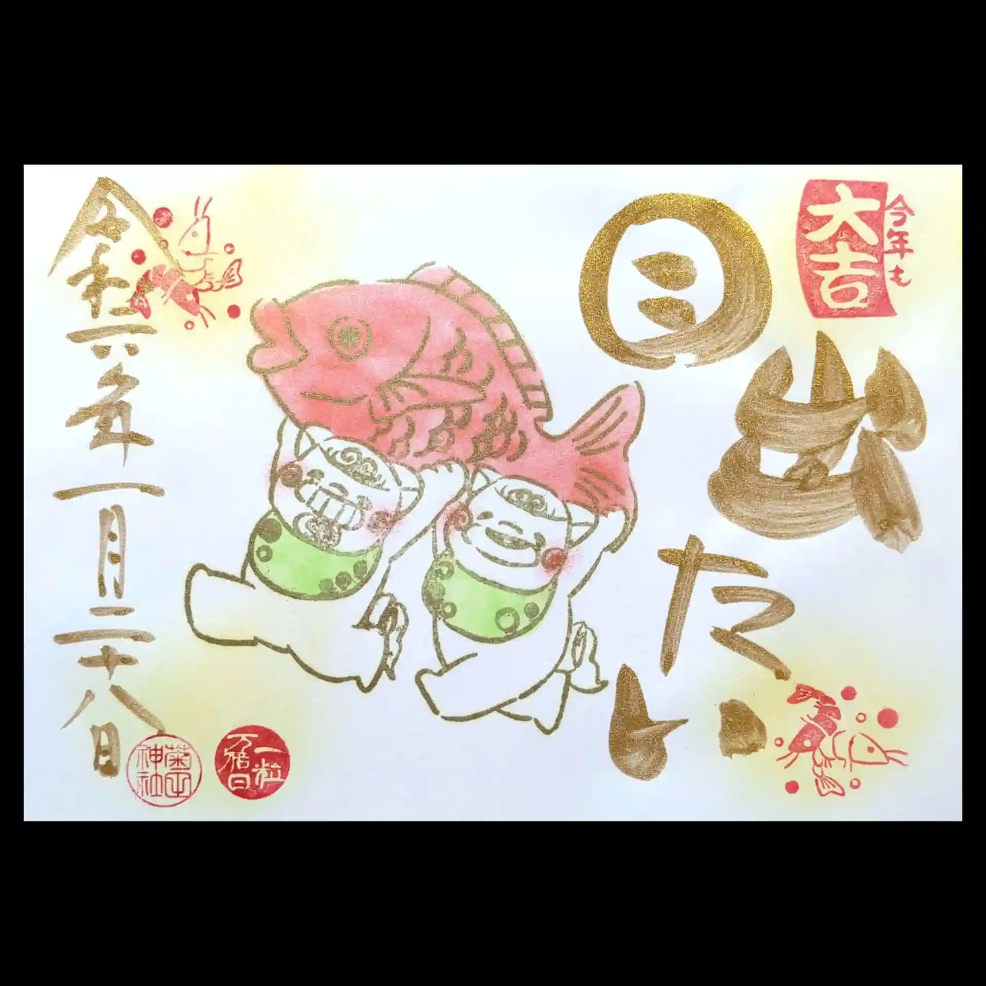 1月の「狛犬の御朱印」は目出鯛を持ったアイーンの狛犬さん。