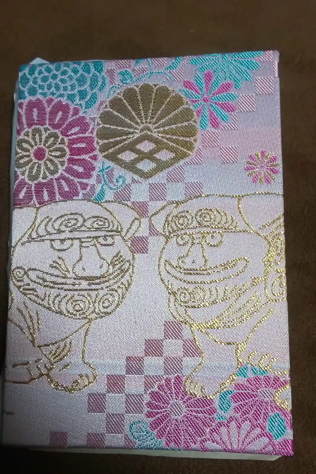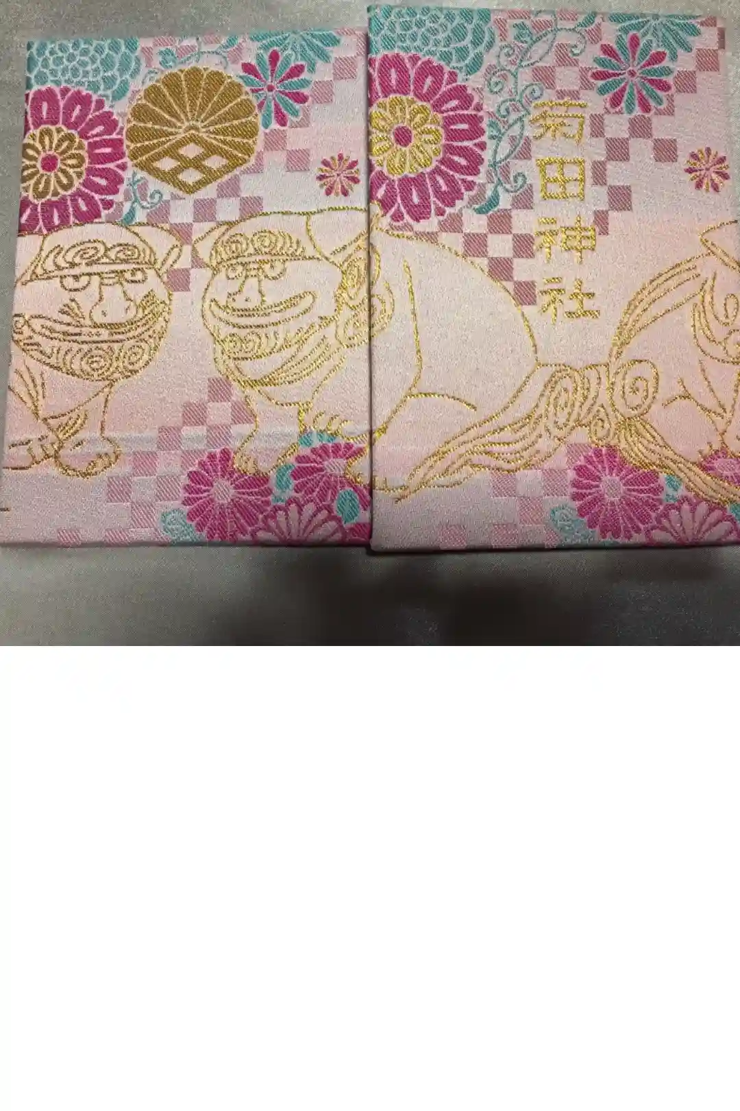御朱印帳(緑)。通常サイズ。通称アイーン狛犬さんと菊の花が描かれています。氏神様以外の神社用の2冊目です。