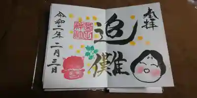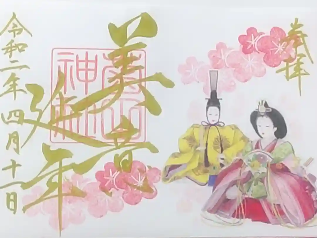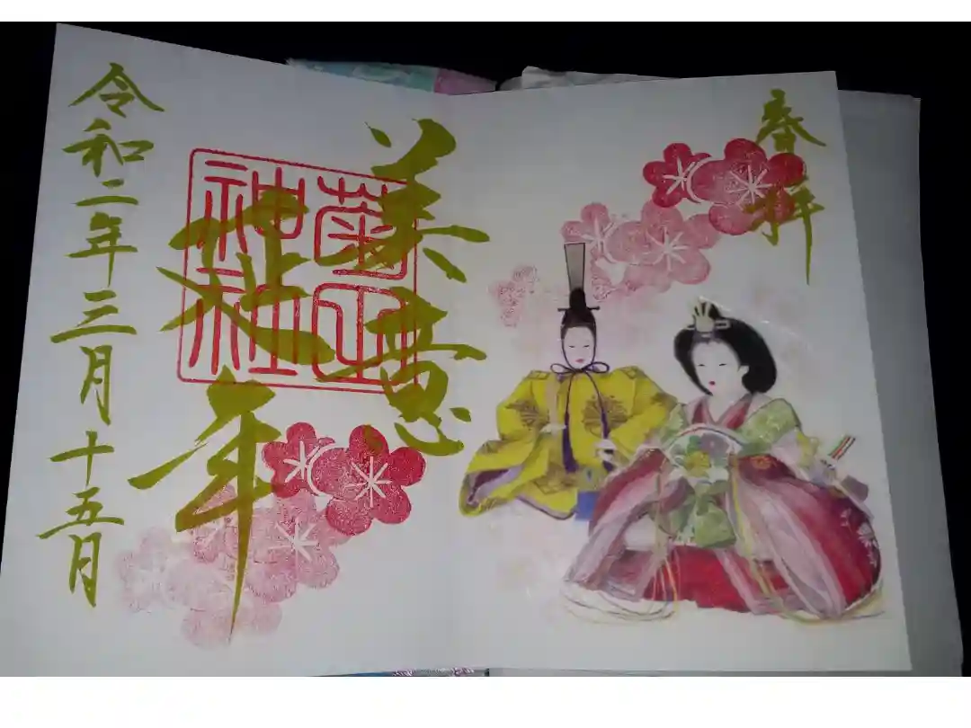 3月の限定御朱印。お雛様がシールになっていて、御朱印帳に直接書き入れていただけます。美の文字に勢いがあり2ページにわたり書いていただけました。