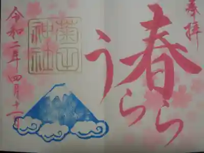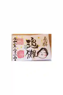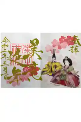 2020年3月限定御朱印。萌黄色の墨で書かれています。和紙シールのお雛様を貼ることで、書き置き印刷をせずに、カラフル御朱印を実現しています。素敵なアイデアです。