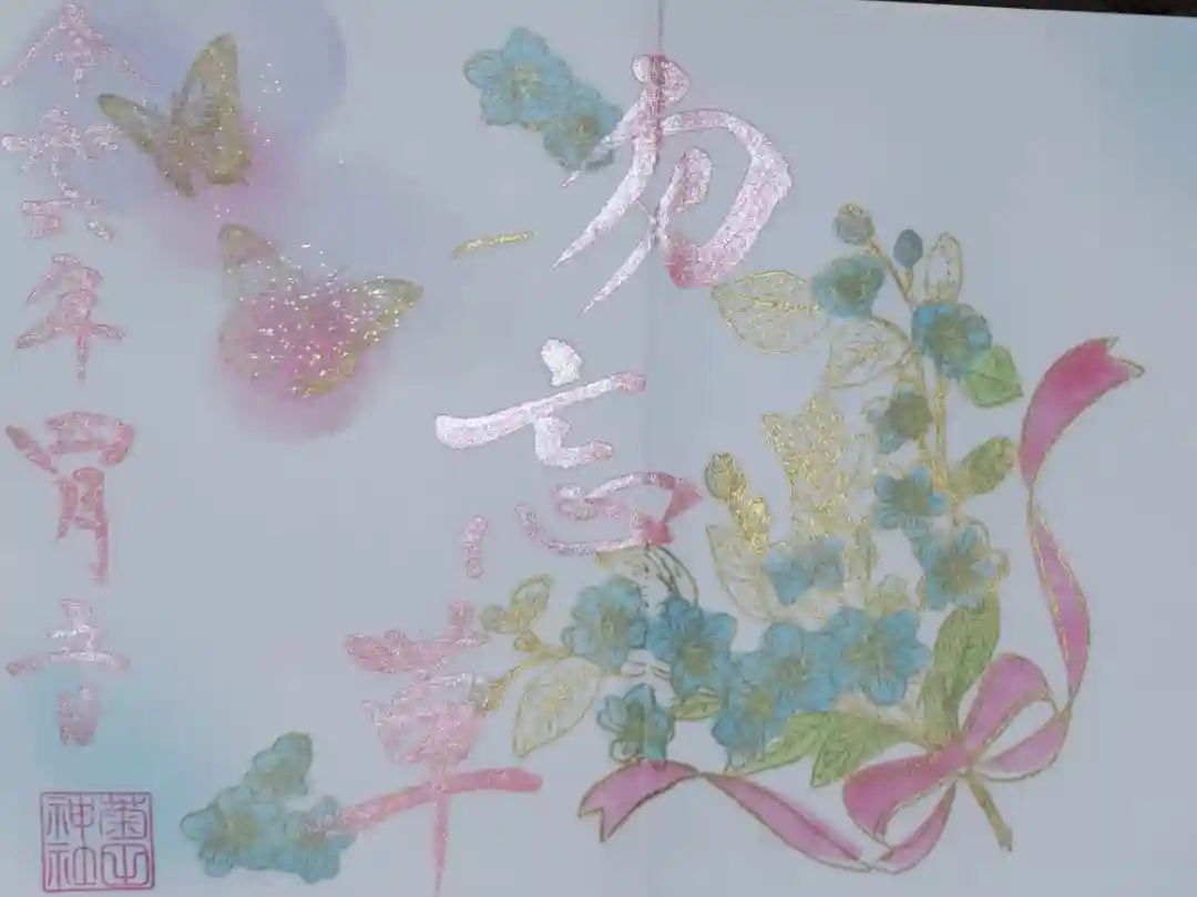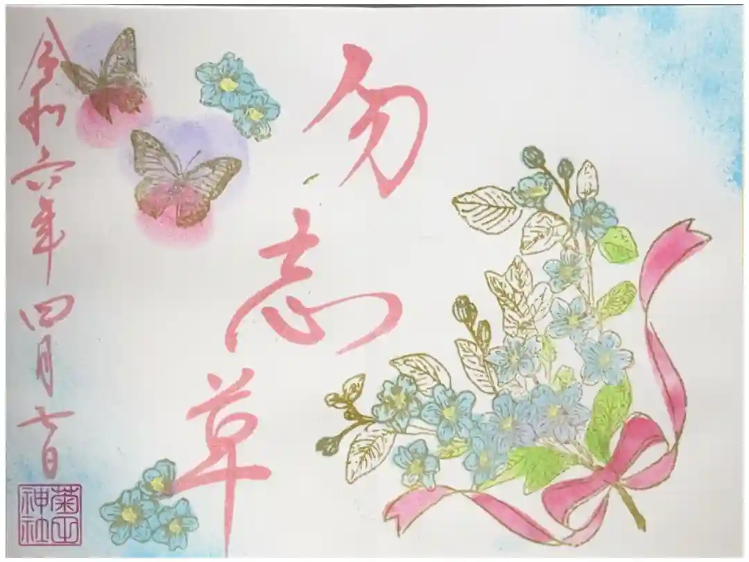 令和6年4月御朱印。勿忘草。忘れな草の花束とアゲハチョウの絵