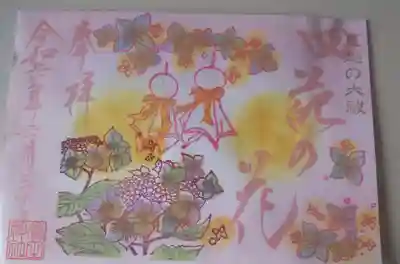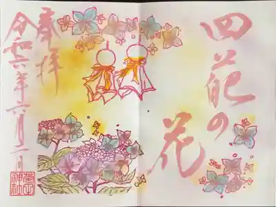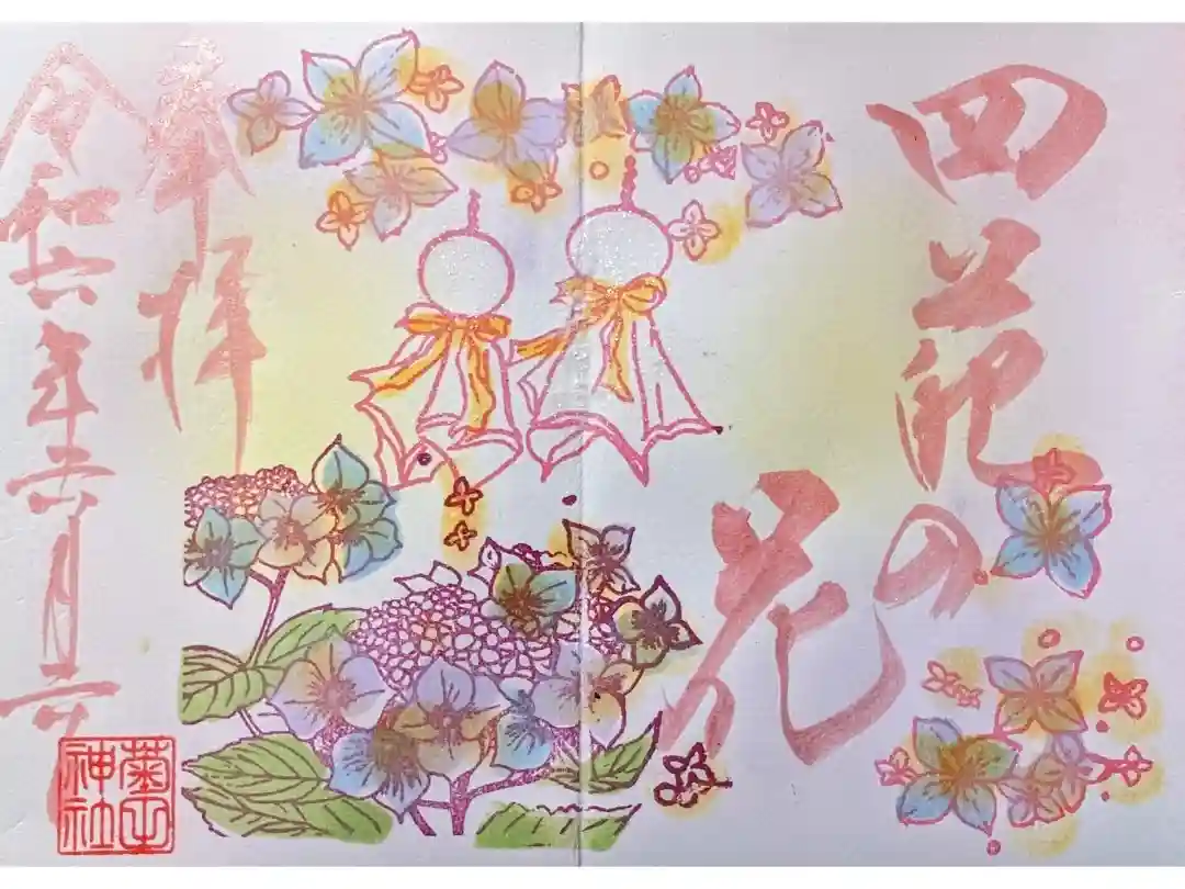 令和六年6月季節の御朱印。四苑の花。紫陽花(あじさい)とてるてる坊主の絵