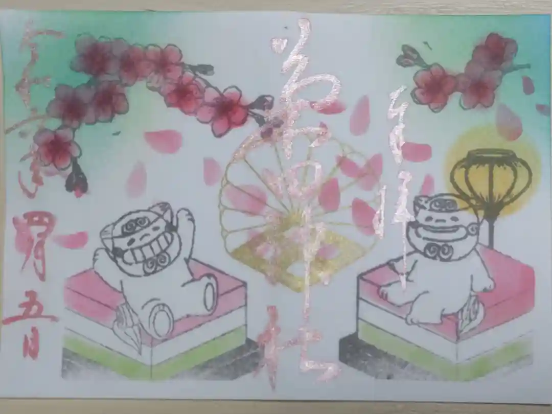 令和6年3月御朱印。狛犬とひなまつりの菱形餅、ぼんぼり、桃の花の絵