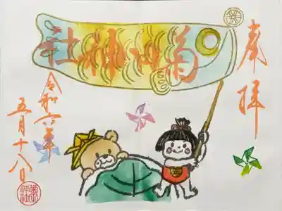 令和六年5月こどもの日御朱印。こいのぼりを振る金太郎、折り紙兜をかぶったくま、風車、巨大柏餅の絵