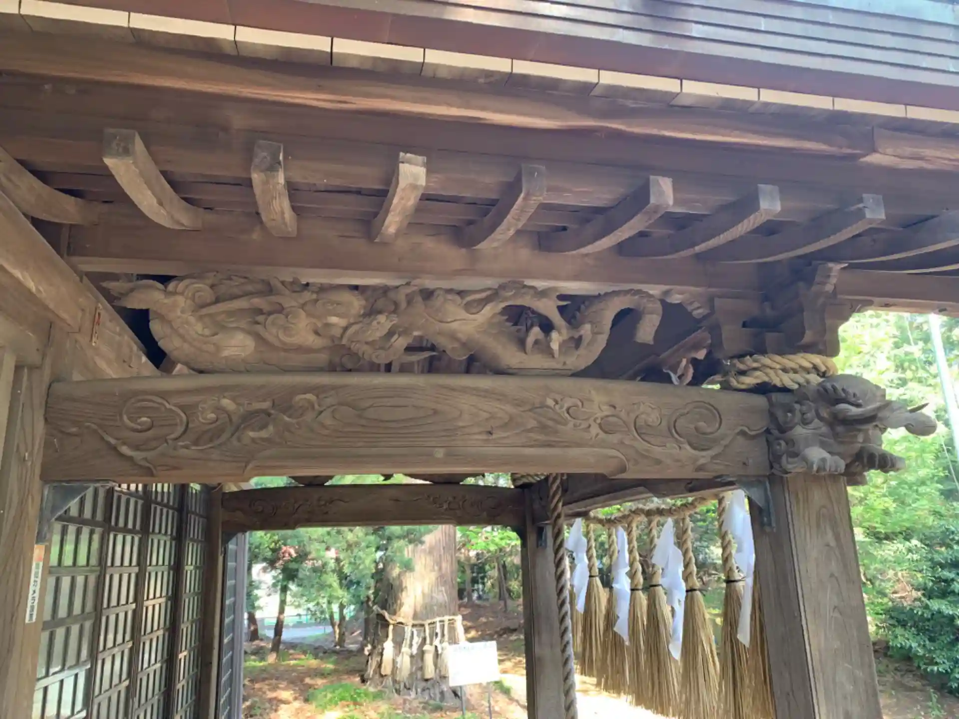狛猿が特徴的。社殿には三方に龍が飾られていました。珠の持ち方が波の伊八の作品に似ており、この作品の作者はわかりませんが伊八をリスペクトしたのではと考えています。