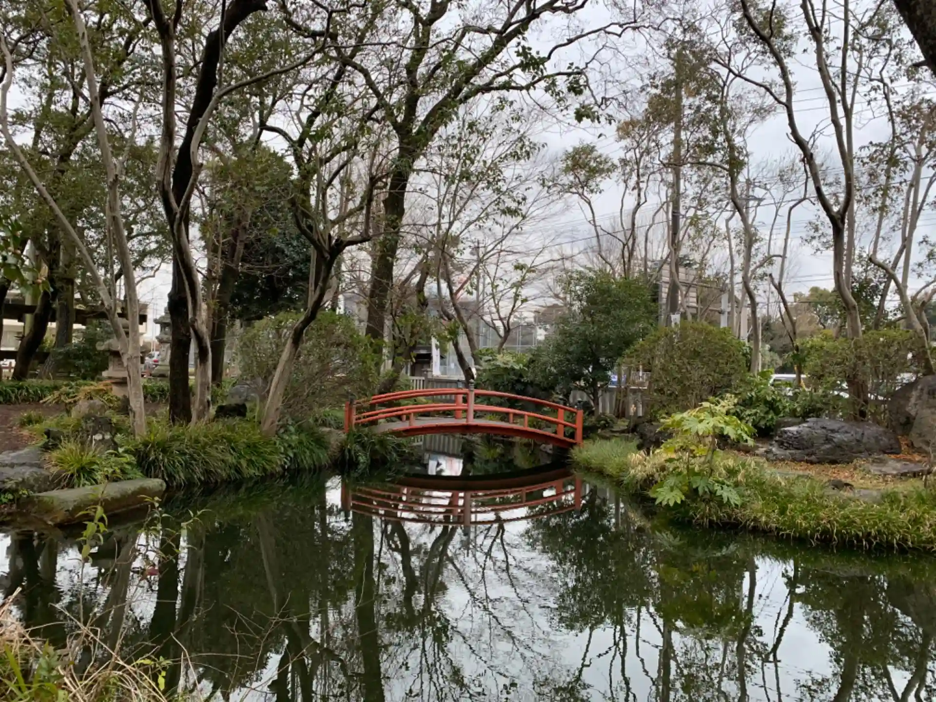 鳥居の脇には神事に用いる放生池という大きめの池があり、赤い橋が緑豊かな周囲によく映えます。