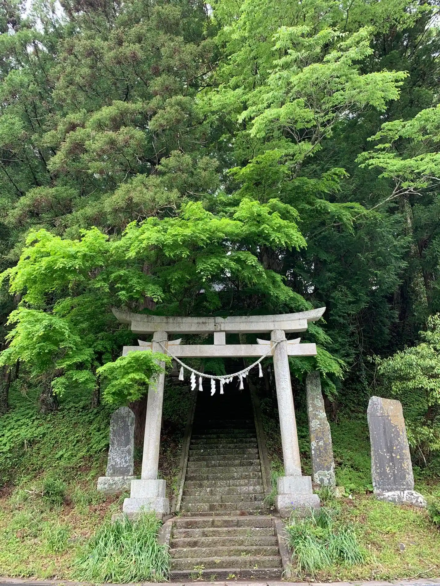 鳥居と社叢が道路に迫るように立地しています。長くて真っ直ぐな石段を登ると厳かな社殿があり、立派な彫刻が飾られています。とても雰囲気がいいです。