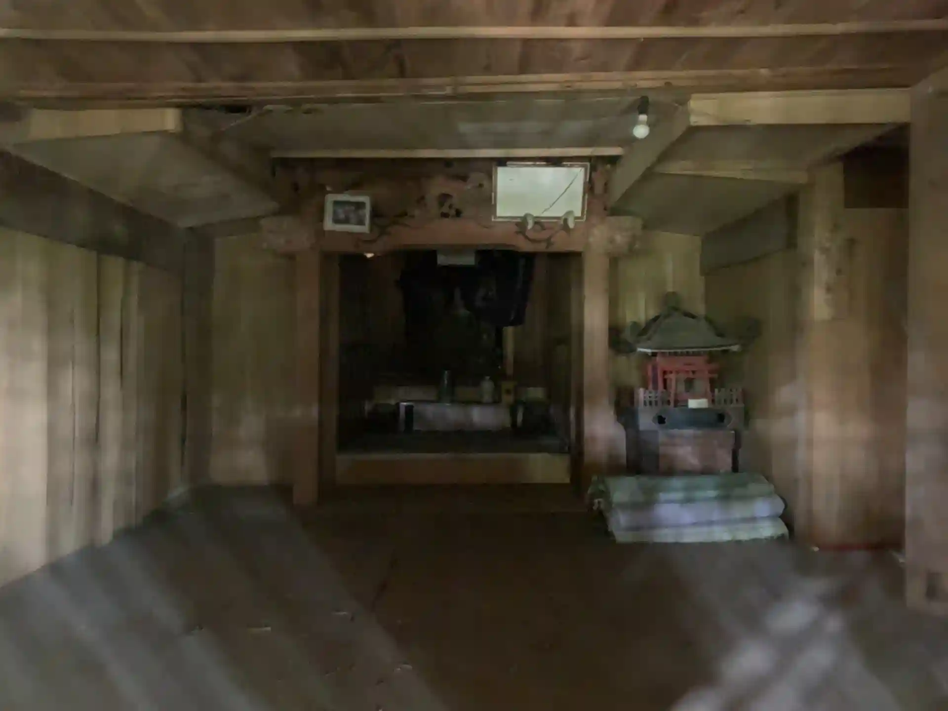 民家の隙間のレンガの壁沿いから進入できるとてもわかりづらい神社。