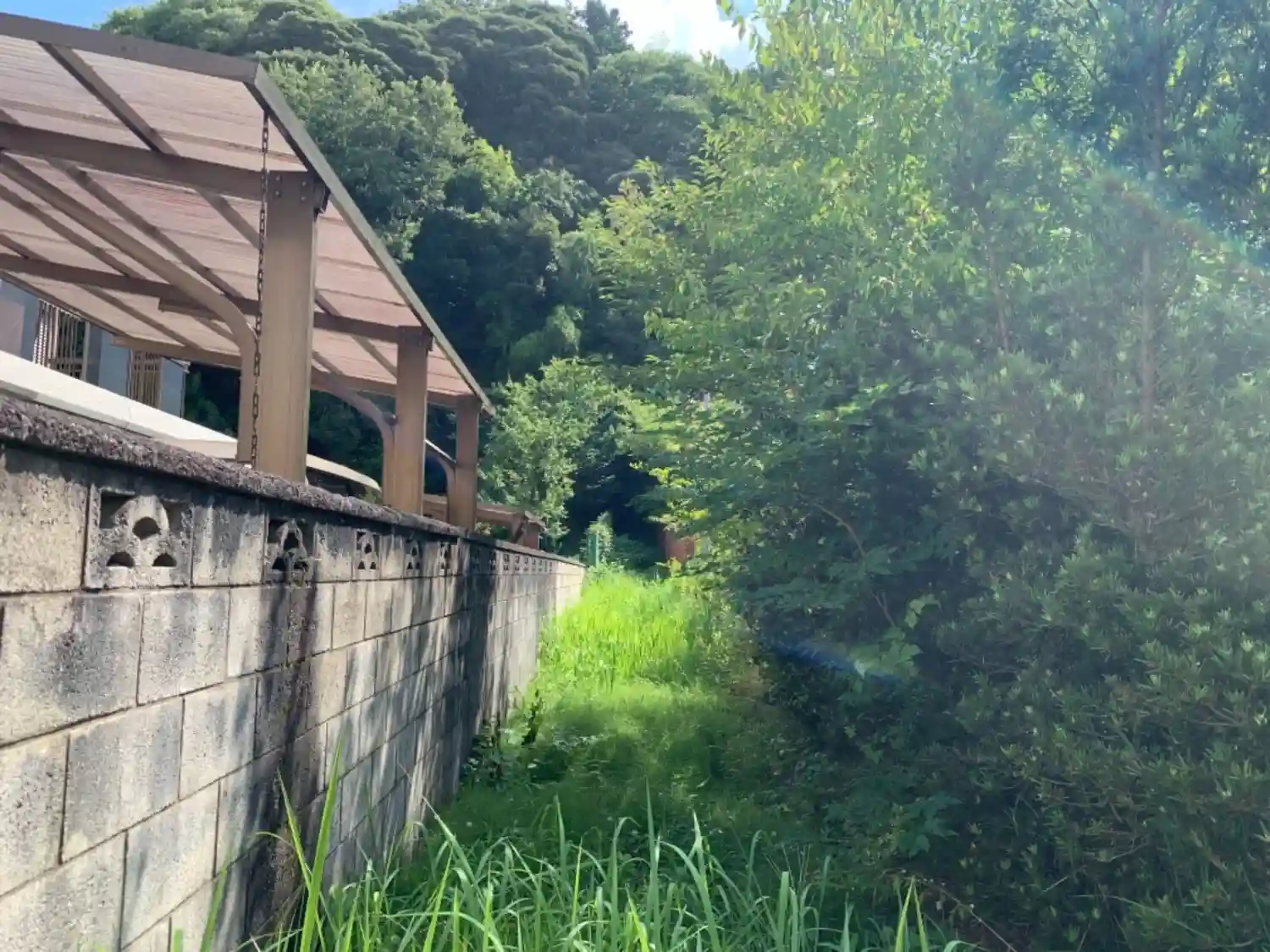 民家の隙間のレンガの壁沿いから進入できるとてもわかりづらい神社。
