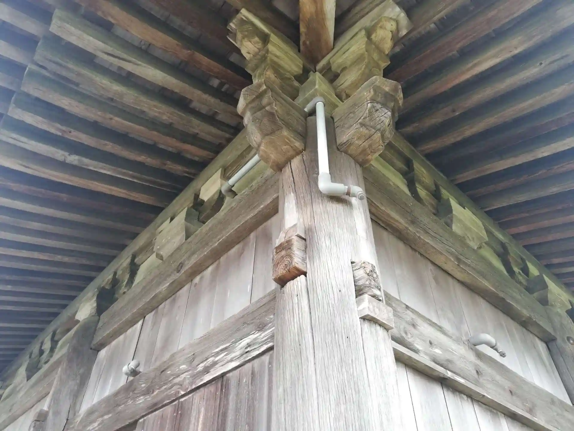 お堂の壁にスプリンクラーが沢山ついています。