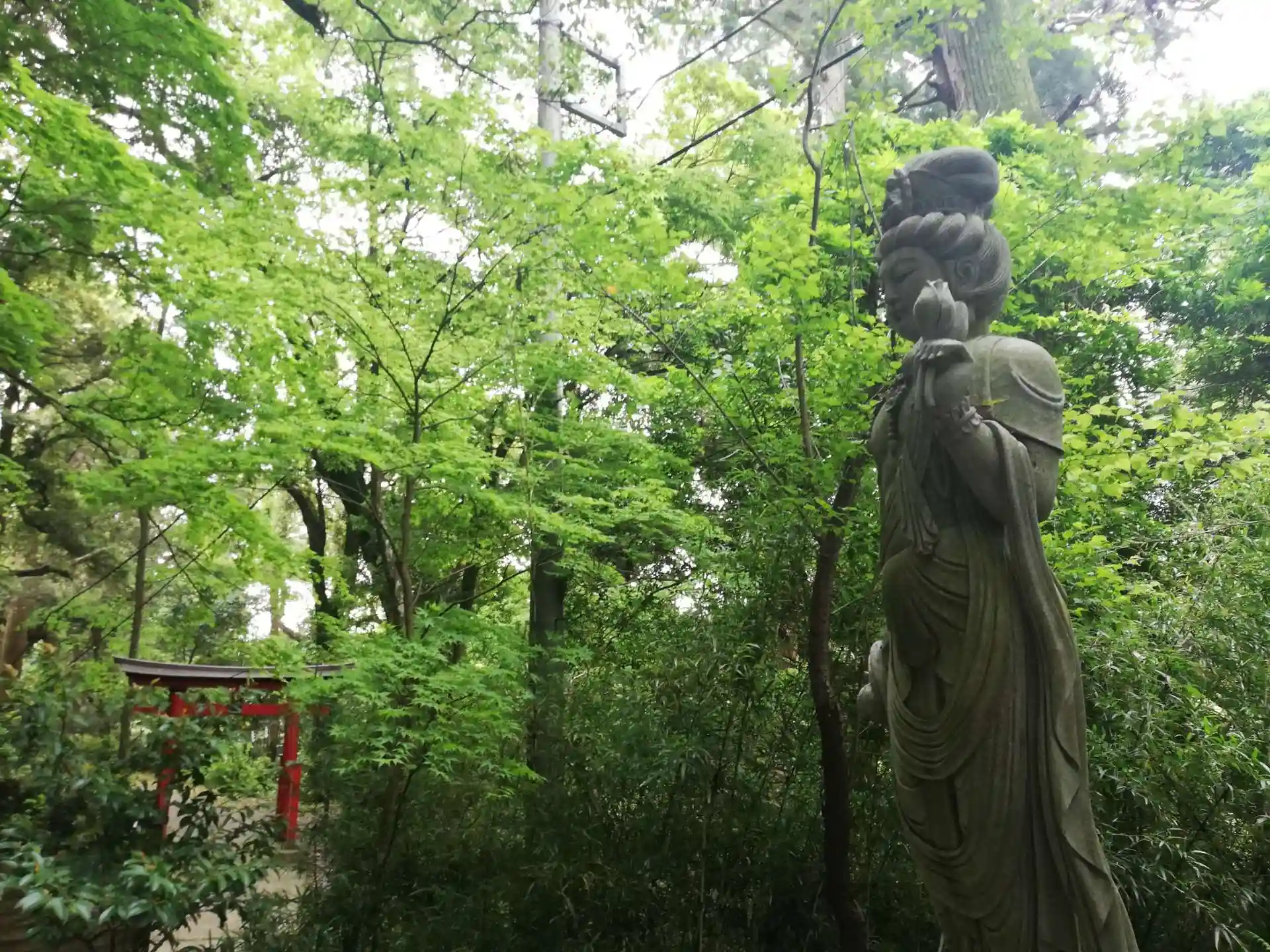子授観音様と熊野社の鳥居。5月の新緑が雨で生き生きとしています。ご神木の洞から撮影するスポットは大人気でしたので、他の撮影者の邪魔にならない横から撮りました。